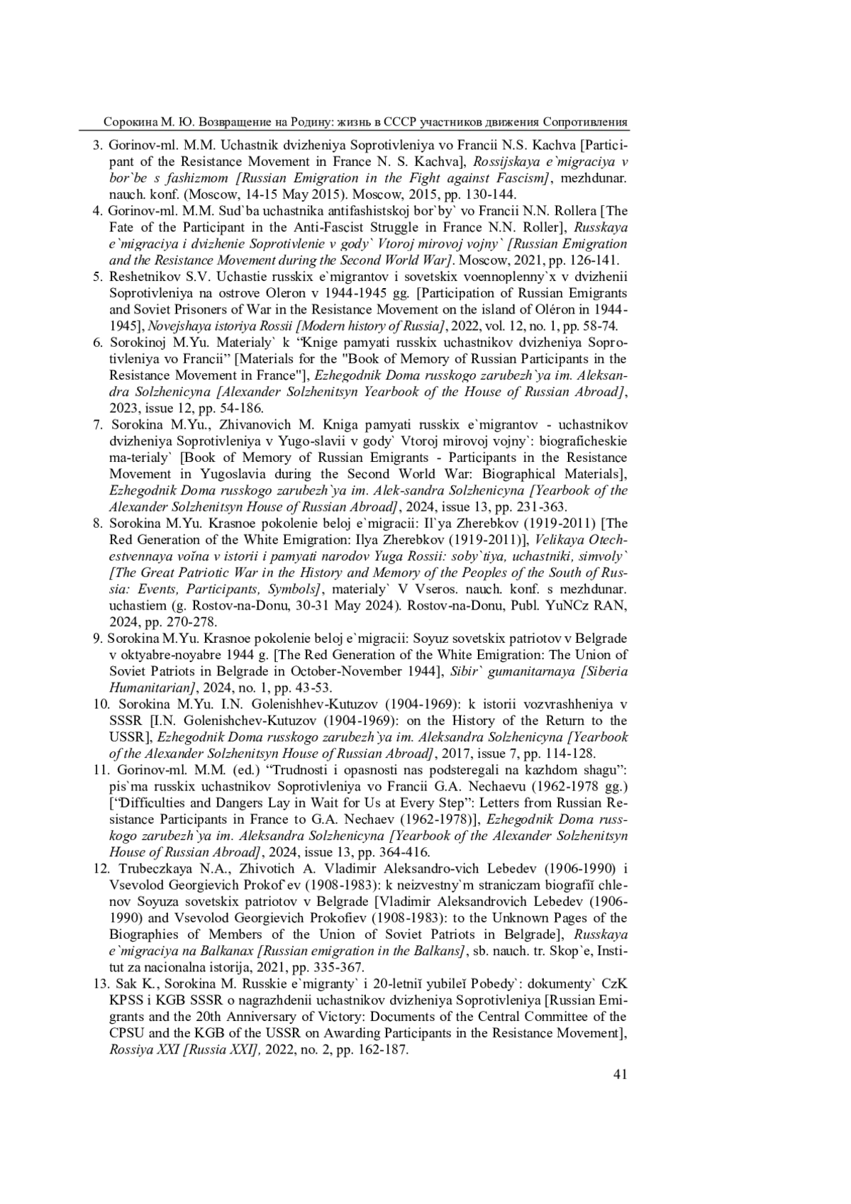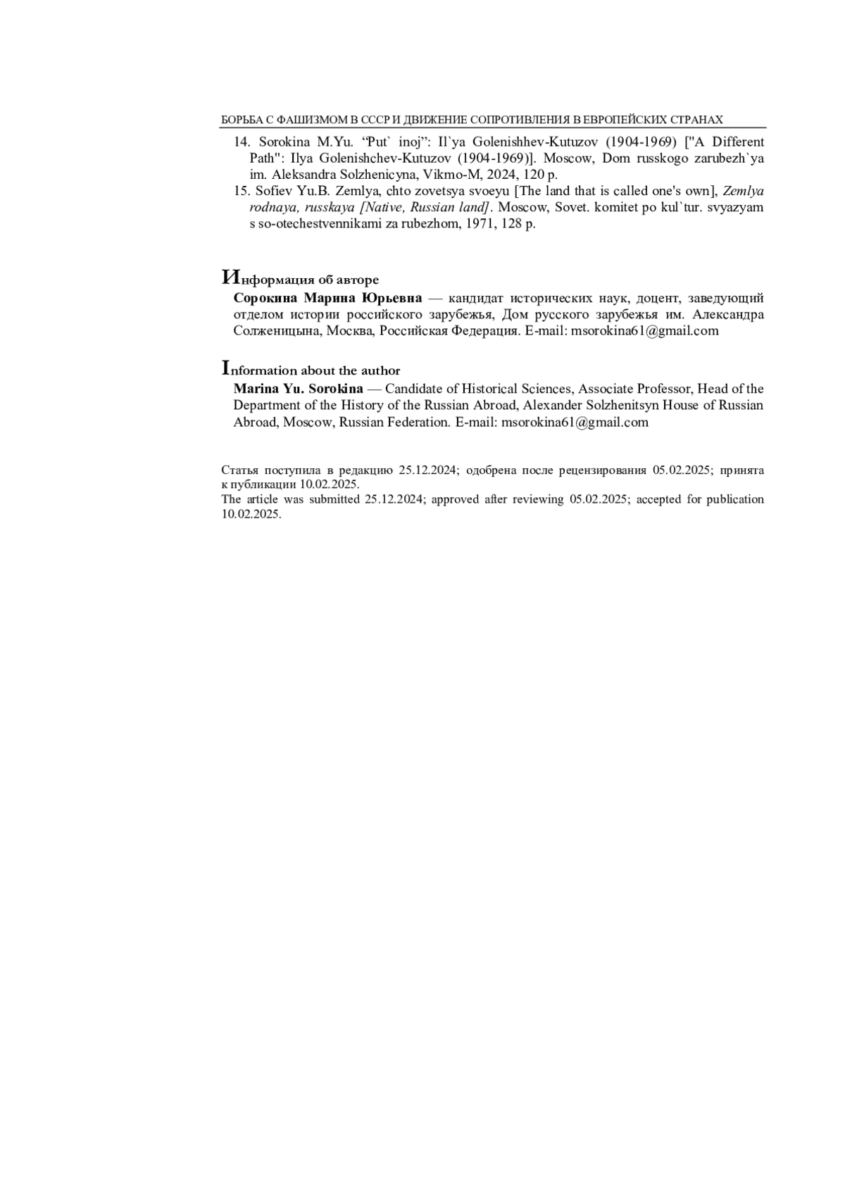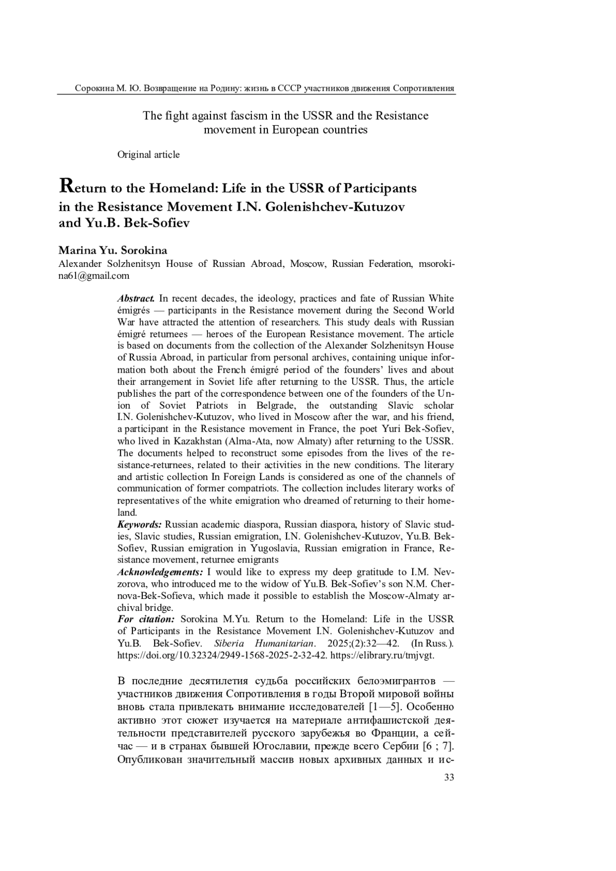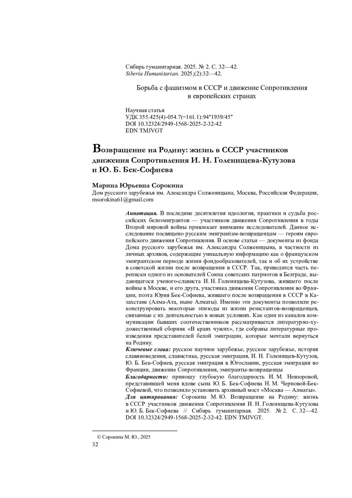 СОРОКИНА М. Ю. ВОЗВРАЩЕНИЕ НА РОДИНУ: ЖИЗНЬ В СССР УЧАСТНИКОВ ДВИЖЕНИЯ СОПРОТИВЛЕНИЯ И. Н. ГОЛЕНИЩЕВА-КУТУЗОВА И Ю. Б. БЕК-СОФИЕВА // СИБИРЬ ГУМАНИТАРНАЯ. 2025. № 2 (10)