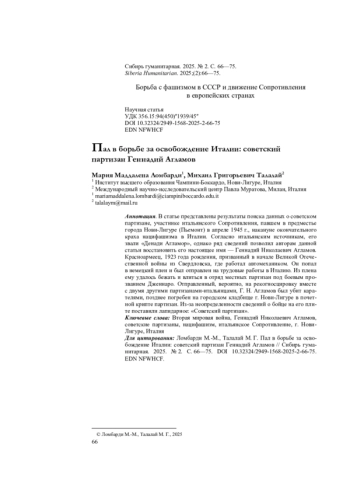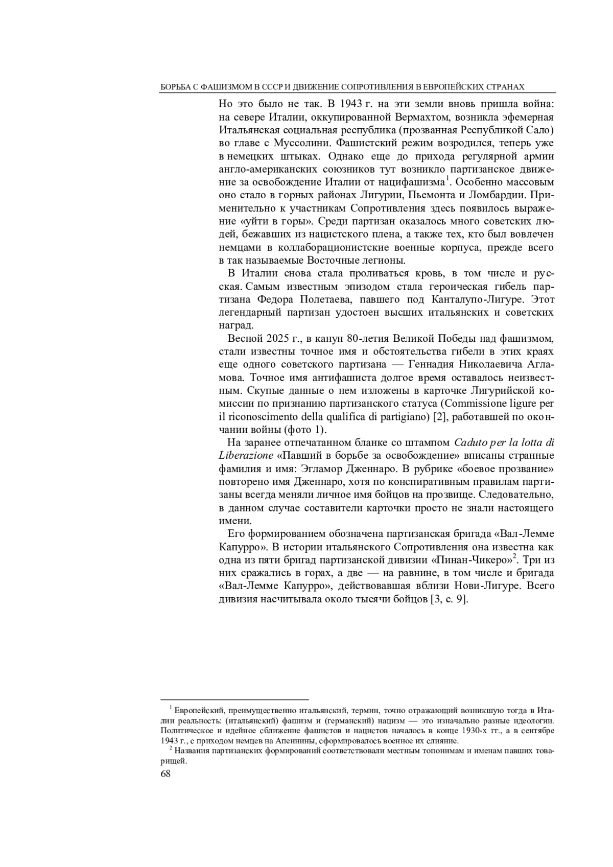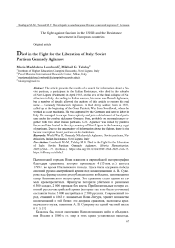 Итальянское движение Сопротивления как феномен Второй мировой войны возникло в период падения режима Муссолини в ответ на последовавшее за ним вторжение нацистской Германии на Апеннинский полуостров, а также постепенное продвижение англо-американских союзников на север полуострова после высадки на Сицилии. Часть бывших военнослужащих Королевской итальянской армии и представители гражданского населения объединились в вооруженные отряды на основе неприятия нацифашизма, идеологии, характеризующейся политическим и идеологическим сближением фашизма и нацизма, начавшемся в 1930-х гг. Именно к этим отрядам примкнули советские люди, преимущественно бежавшие военнопленные и дезертировавшие восточные легионеры. В общей сложности в рядах Сопротивления насчитывалось около 6 тыс. советских бойцов, т. е. около половины иностранного контингента Сопротивления, не менее полутысячи человек погибло. Многие из них получили награды от итальянского государства.