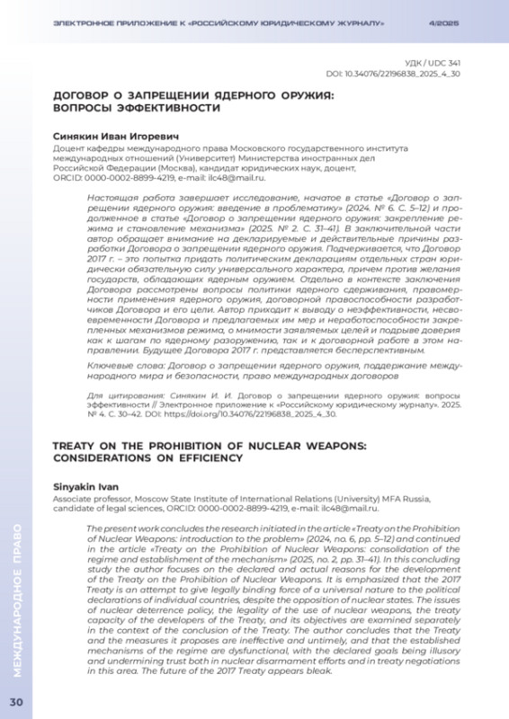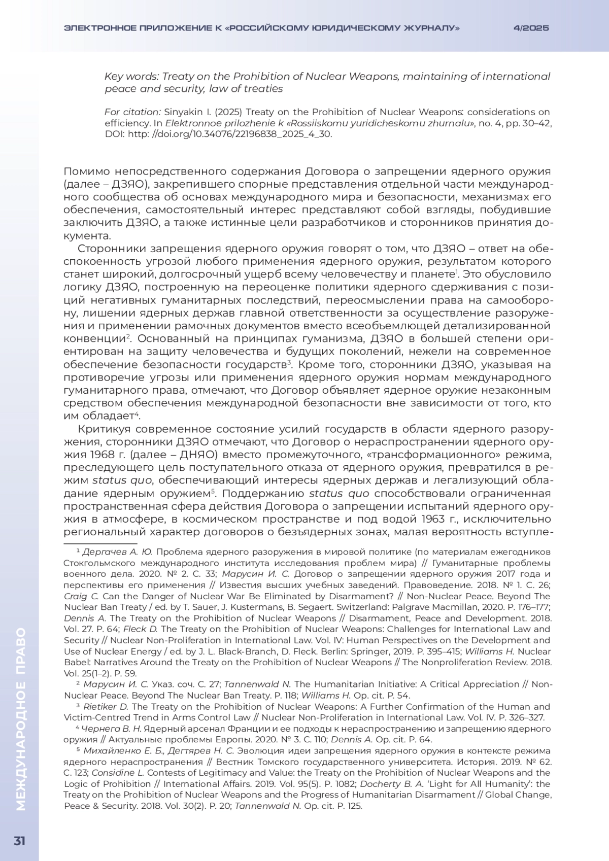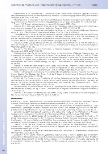 8. Марусин И. С. Договор о запрещении ядерного оружия 2017 года и перспективы его применения // Известия высших учебных заведений. Правоведение. 2018. № 1. С. 20-31. EDN: UYYMIQ
