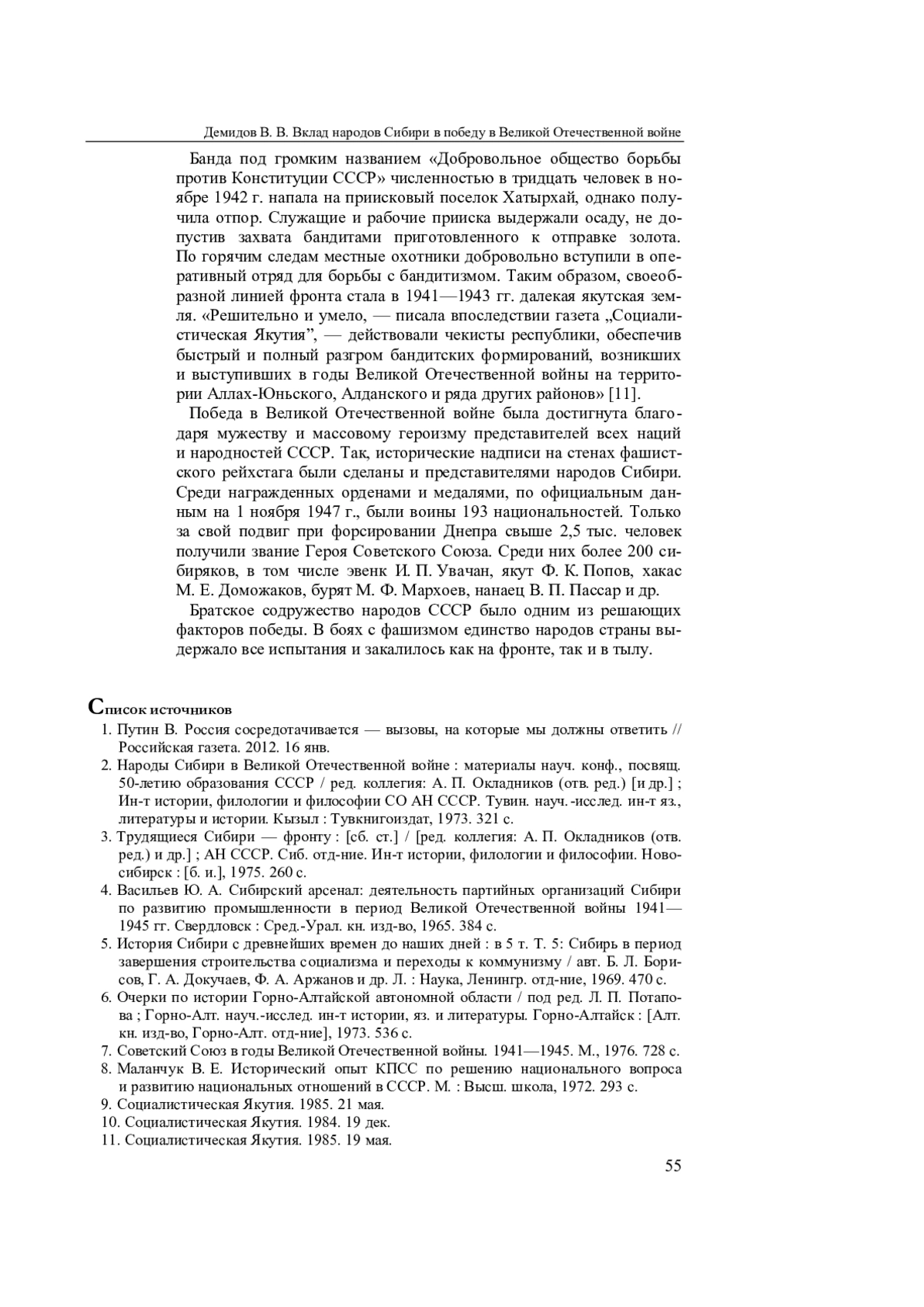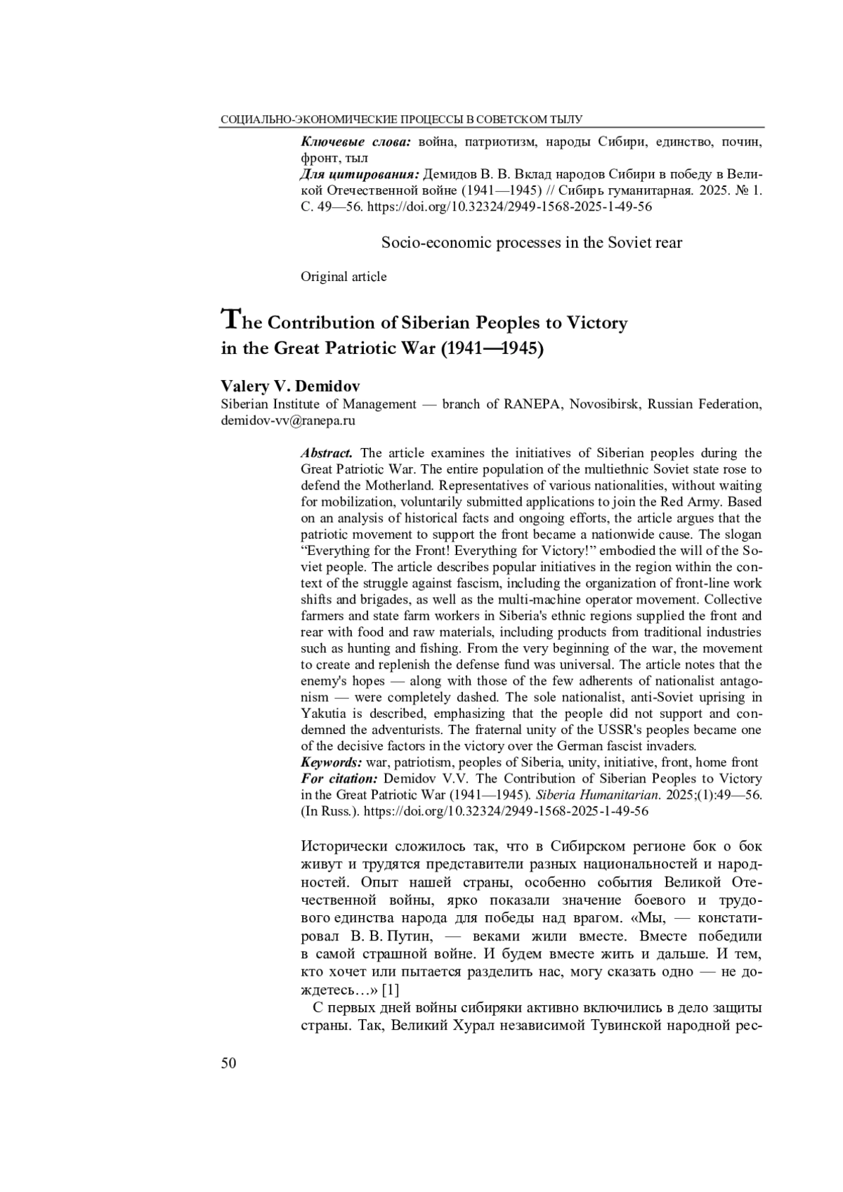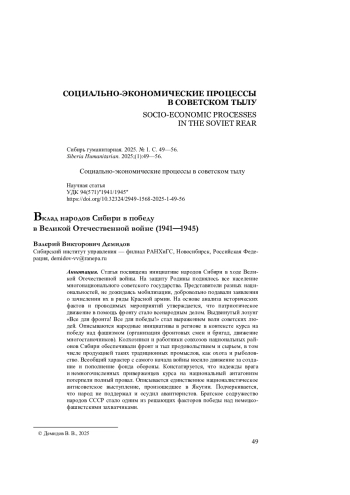 ДЕМИДОВ В. В. ВКЛАД НАРОДОВ СИБИРИ В ПОБЕДУ В ВЕЛИКОЙ ОТЕЧЕСТВЕННОЙ ВОЙНЕ (1941—1945) // СИБИРЬ ГУМАНИТАРНАЯ. 2025. № 1 (9)