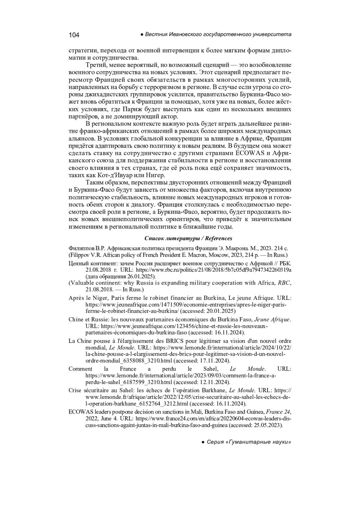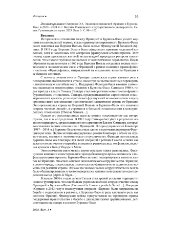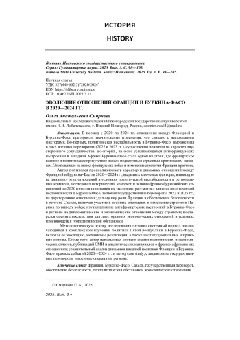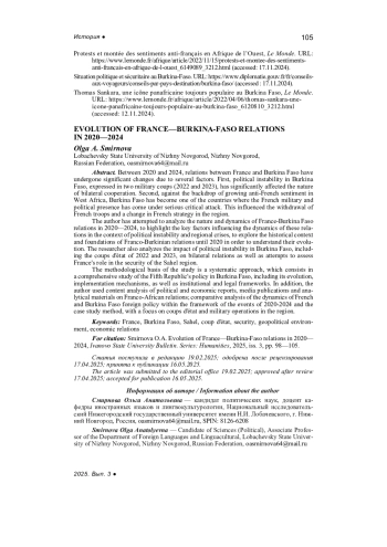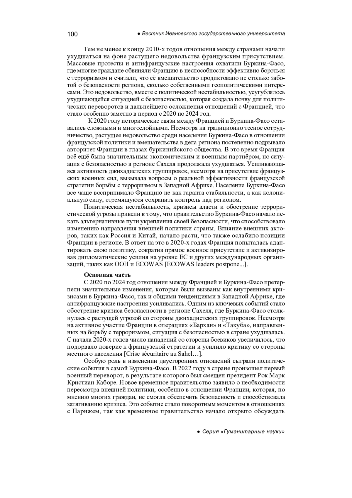 СМИРНОВА О. А. ЭВОЛЮЦИЯ ОТНОШЕНИЙ ФРАНЦИИ И БУРКИНА-ФАСО В 2020-2024 ГГ // ВЕСТНИК ИВАНОВСКОГО ГОСУДАРСТВЕННОГО УНИВЕРСИТЕТА. СЕРИЯ: ГУМАНИТАРНЫЕ НАУКИ. 2025. № 3