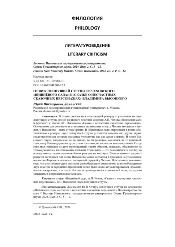 В статье соотносятся содержащий ремарку с указанием на звук лопнувшей струны эпизод из второго действия комедии А. П. Чехова «Вишнёвый сад» и фрагмент из песни В. С. Высоцкого «Сказка о несчастных сказочных персонажах». Основанием для соотнесения становятся упоминания птиц: у Чехова это цапля и филин, у Высоцкого – выпь и тоже филин. В «Вишнёвом саде» персонажи в точно обозначенном в ремарке звуке лопнувшей струны услышали совершенно другие звуки, среди источников которых оказались упомянуты как раз цапля и филин. В песне Высоцкого звуки, издаваемые то ли выпью, то ли филином, оказались не то причиной того, что у Ивана-дурака на душе стало тоскливо, не то знаком этого состояния. Сходство двух эпизодов из двух произведений, таким образом, оказалось обусловлено не только указанием на одинаковые названия птиц (выпь — это разновидность цапли), но и сходство состояния персонажей в их реакции на эти звуки. В числе прочего рассматривается заглавный для песни Высоцкого мотив несчастья в проекции на упоминание несчастья Фирсом в эпизоде с лопнувшей струной у Чехова. В результате показывается, что соотнесение двух эпизодов способствовало смысловому взаимообогащению двух текстов: в пародийно-ироничной песне Высоцкого актуализировалось драматическое настроение, а в пьесе Чехова актуализировался комический план, загадочно заявленный жанровым подзаголовком