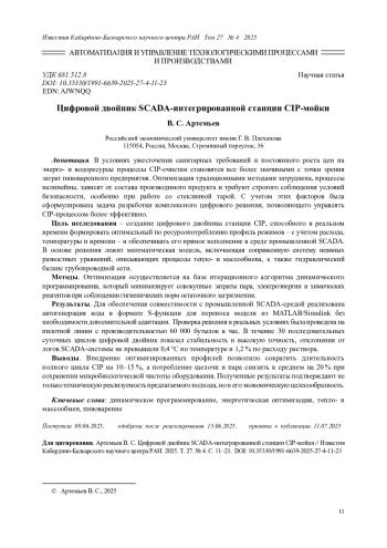 Цель исследования - создание цифрового двойника станции CIP, способного в реальном времени формировать оптимальный по ресурсопотреблению профиль режимов - с учетом расхода, температуры и времени - и обеспечивать его прямое исполнение в среде промышленной SCADA. В основе решения лежит математическая модель, включающая сопряженную систему неявных разностных уравнений, описывающих процессы тепло- и массообмена, а также гидравлический баланс трубопроводной сети.