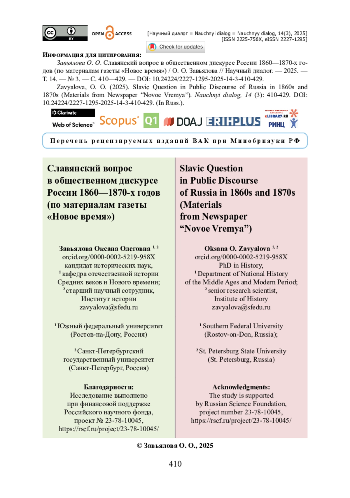 6. Завьялова О. О. В борьбе с «бестактным либерализмом» : А. К. Киркор и газета «Новое время» о последствиях Великих реформ. В конце 1860-х - начале 1870-х гг. / О. О. Завьялова // Historia provinciae - журнал региональной истории. - 2023. - Т. 7. - С. 762-809. - https://doi.org/10.23859/2587-8344-2023-7-3-1.