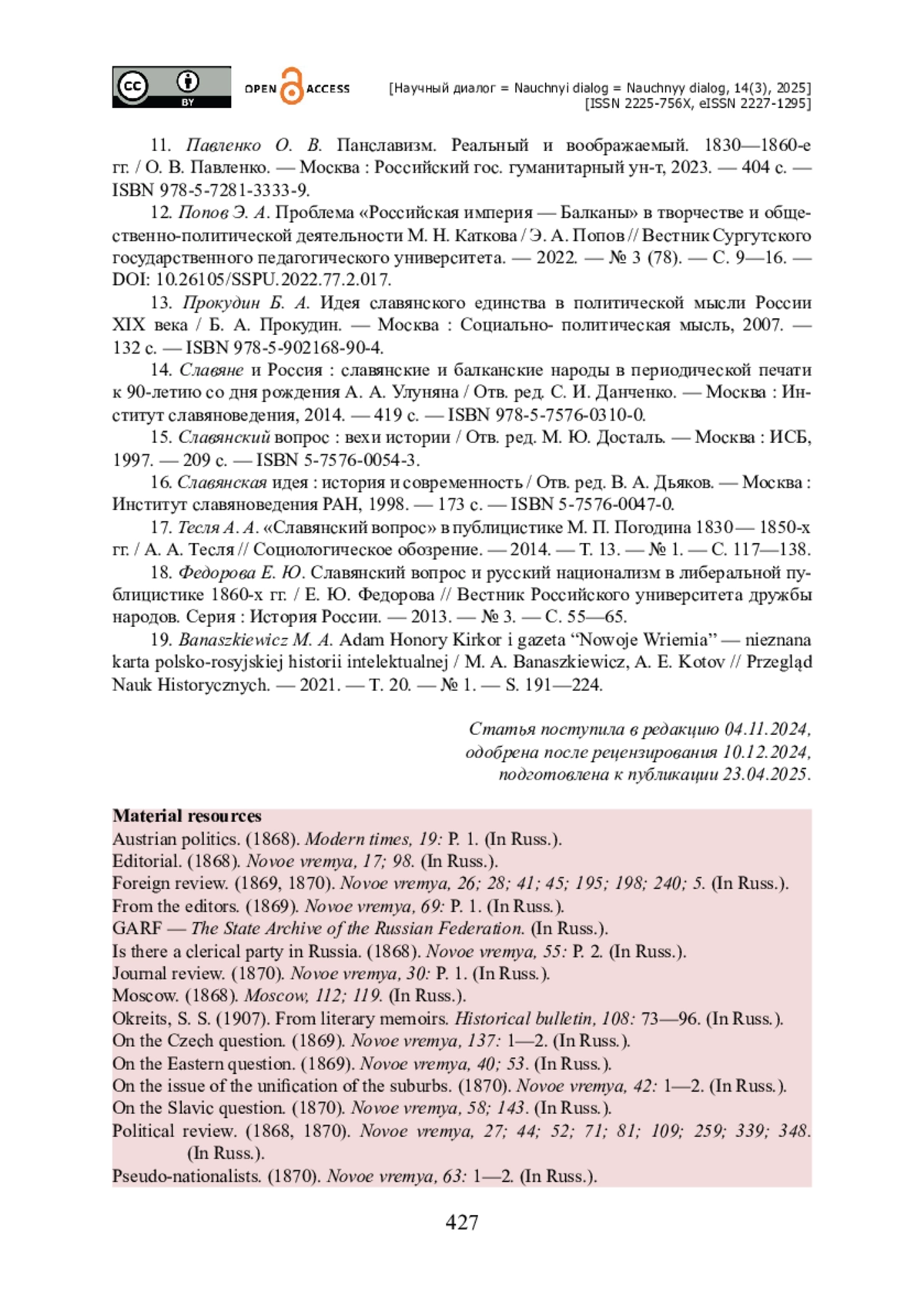 18. Федорова Е. Ю. Славянский вопрос и русский национализм в либеральной публицистике 1860-х гг. / Е. Ю. Федорова // Вестник Российского университета дружбы народов. Серия : История России. - 2013. - № 3. - С. 55-65.