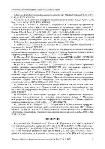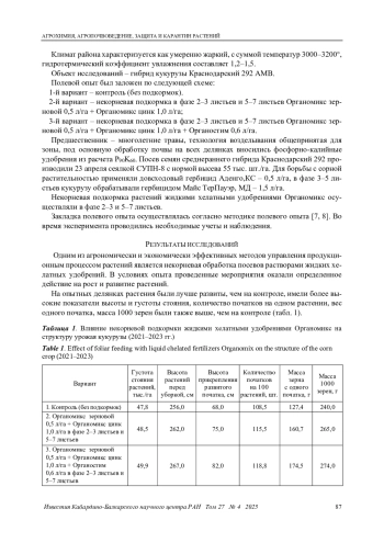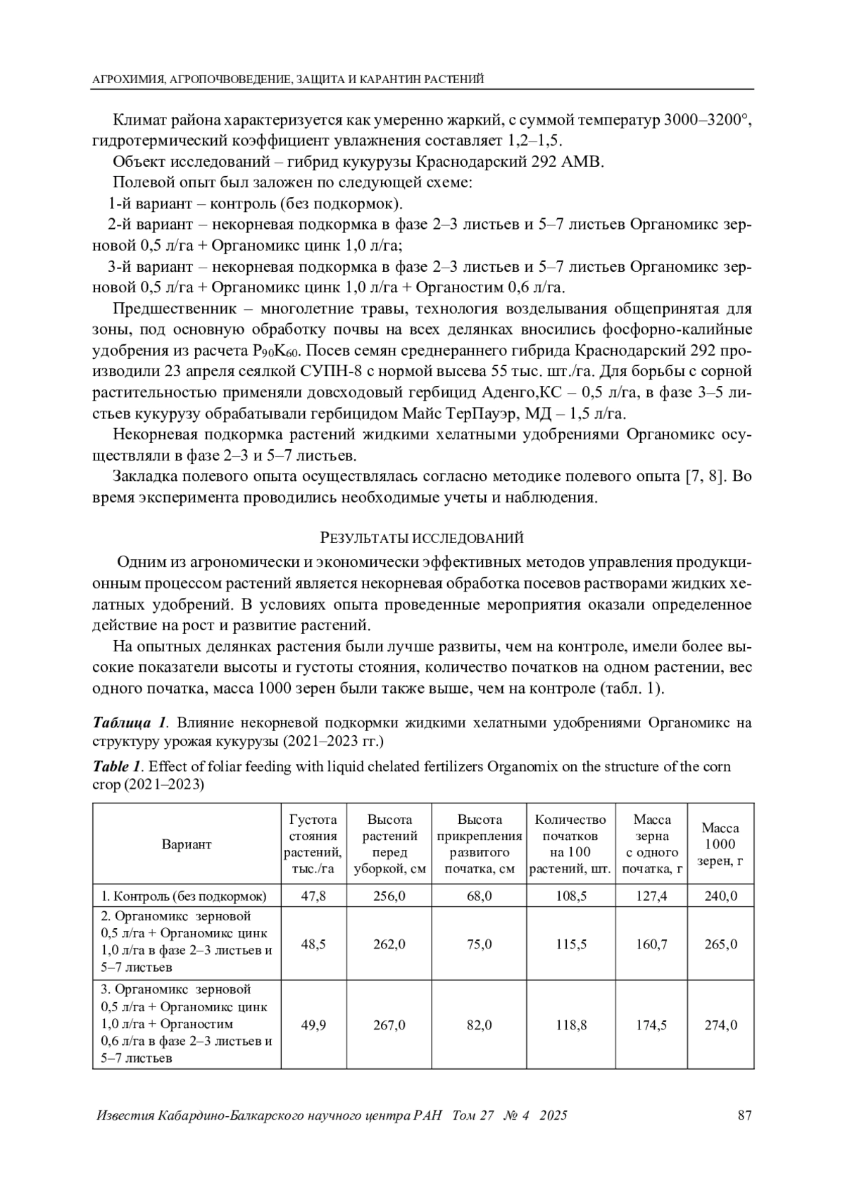 Статья: ВЛИЯНИЕ ХЕЛАТНЫХ УДОБРЕНИЙ ОРГАНОМИКС НА УРОЖАЙНОСТЬ КУКУРУЗЫ В УСЛОВИЯХ ПРЕДГОРНОЙ ЗОНЫ КБР (2025)