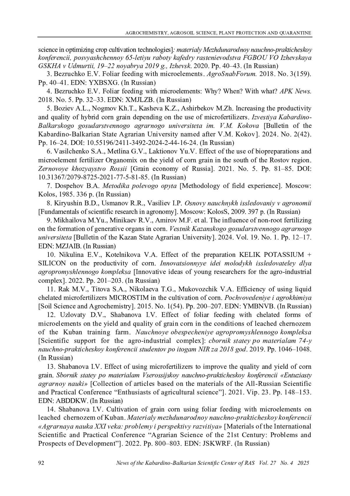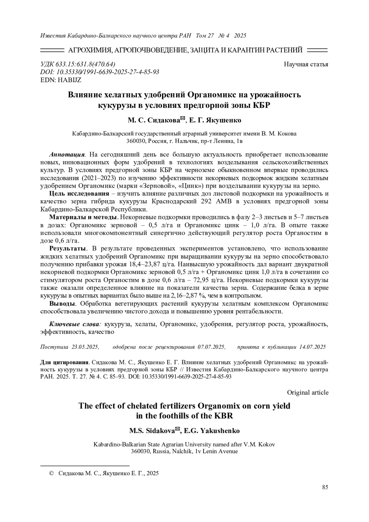 СИДАКОВА М. С., ЯКУШЕНКО Е. Г. ВЛИЯНИЕ ХЕЛАТНЫХ УДОБРЕНИЙ ОРГАНОМИКС НА УРОЖАЙНОСТЬ КУКУРУЗЫ В УСЛОВИЯХ ПРЕДГОРНОЙ ЗОНЫ КБР // ИЗВЕСТИЯ КАБАРДИНО-БАЛКАРСКОГО НАУЧНОГО ЦЕНТРА РАН. 2025. ТОМ 27 № 4