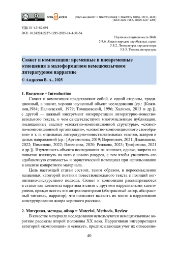 В статье предпринимается попытка переосмысления традиционных понятий поэтики с позиций когнитивно-дискурсивной парадигмы. Сюжет и композиция рассматриваются как элементы нарратива и соотносятся с его антропоцентрами — нарратором, абстрактным автором и абстрактным читателем. Результаты исследования базируются на анализе корпуса текстов немецкоязычной малоформатной прозы, что позволяет сделать выводы о жанровых особенностях сюжета и композиции короткого рассказа. Нарративный метод интерпретации материала позволил установить, что сюжет и композиция базируются соответственно на временны́х и вневременных отношениях. Подчеркивается, что сюжет отражает каузальную детерминацию частей (эпизодов) нарратива, композиция — функционально-прагматическую, что позволяет отнести сюжет к фиктивному уровню коммуникативной структуры нарратива, а композицию — к абстрактному. Доказано, что бессобытийность сюжета короткого рассказа блокирует доступ к событийности нарратива, которая рассматривается в нарратологии как специфический признак нарратива. Установлено, что событийность малоформатного нарратива формируется на оси композиции, которая содержит прагматические сигналы, складывающиеся в интерпретационную программу, отражающую представления автора об интерпретационных возможностях читателя. Автор приходит к выводу о том, что именно композиция, а не бессобытийный сюжет короткого рассказа обеспечивает необходимый признак нарратива, находящий выражение в нарративном пуанте.