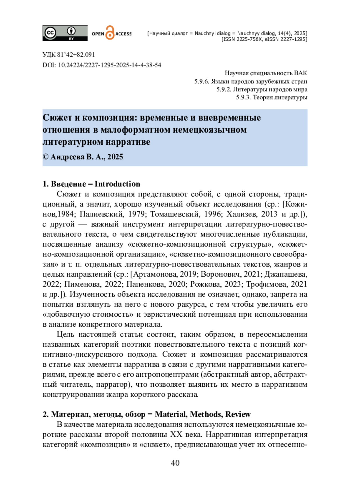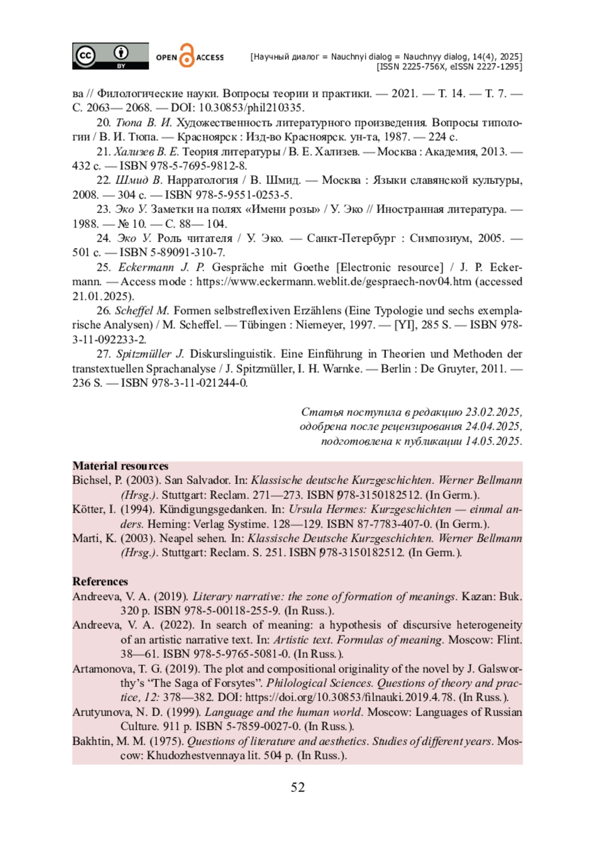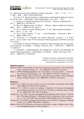2. Андреева В. А. В поисках смысла : гипотеза дискурсивной гетерогенности художественного повествовательного текста / В. А. Андреева // Художественный текст. Формулы смысла. - Москва : Флинта, 2022. - С. 38-61. - ISBN 978-5-9765-5081-0.