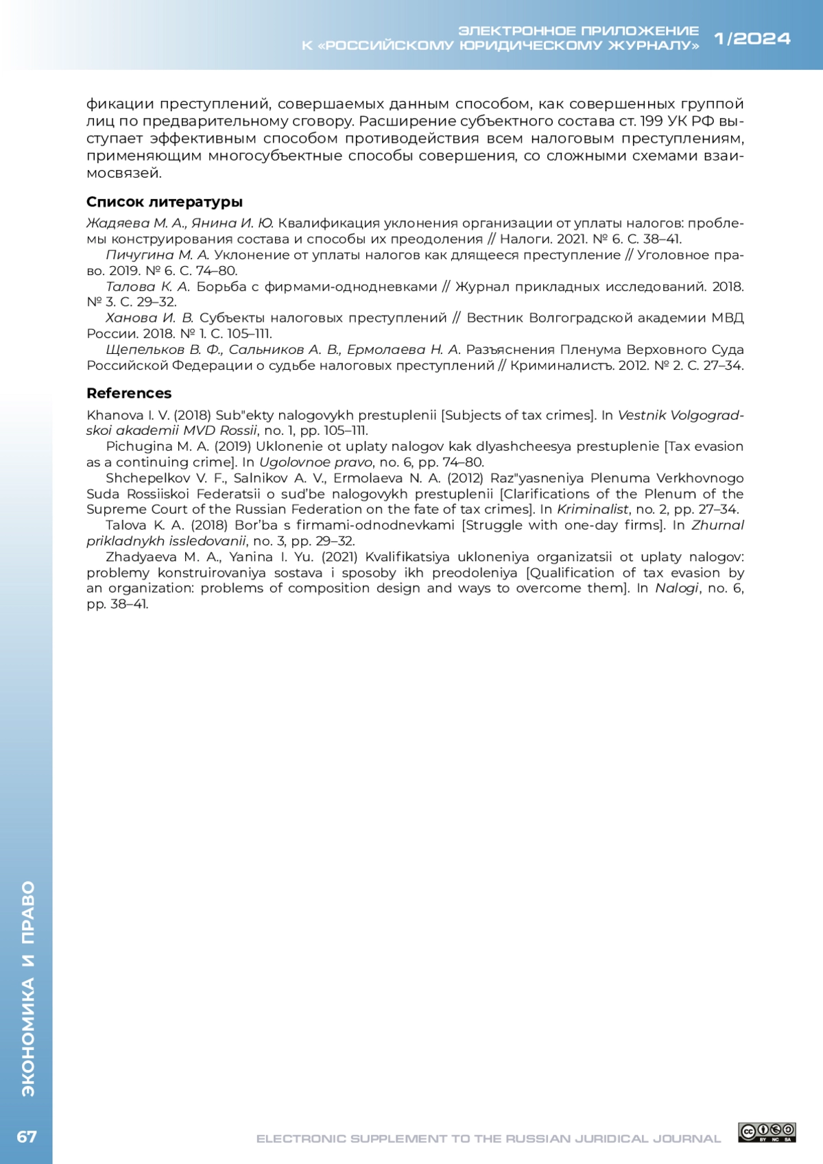 1. Жадяева М. А., Янина И. Ю. Квалификация уклонения организации от уплаты налогов: проблемы конструирования состава и способы их преодоления // Налоги. 2021. № 6. С. 38-41. EDN: HWCCRM