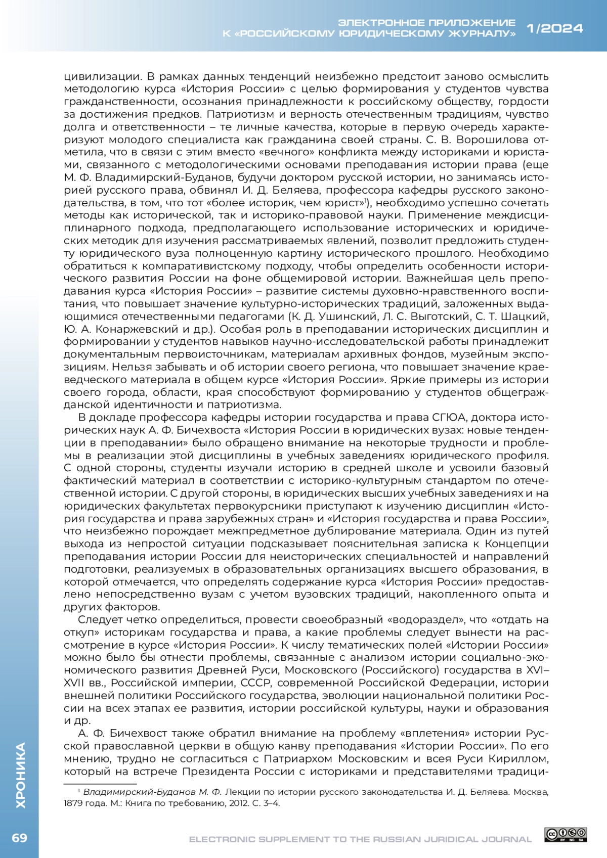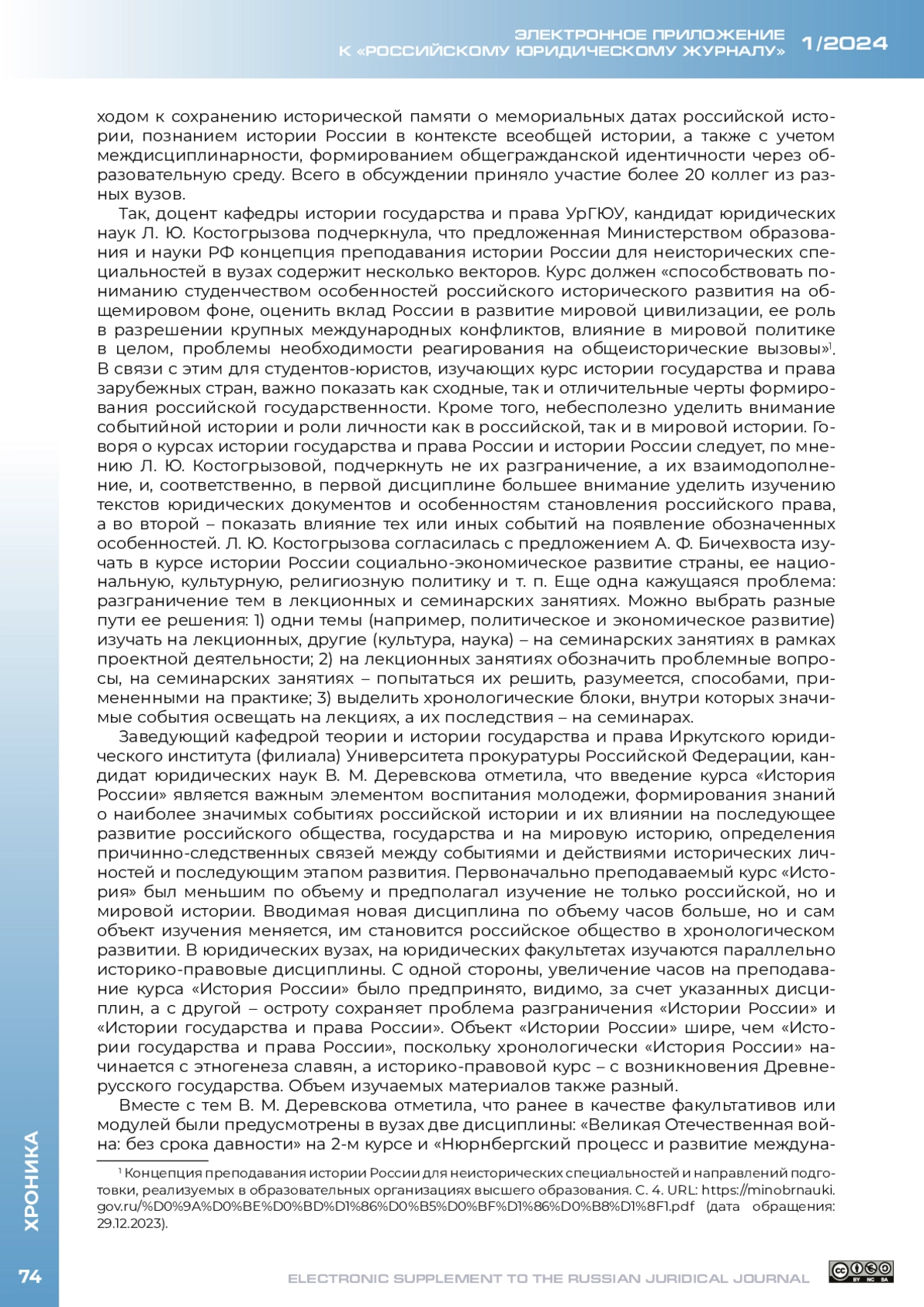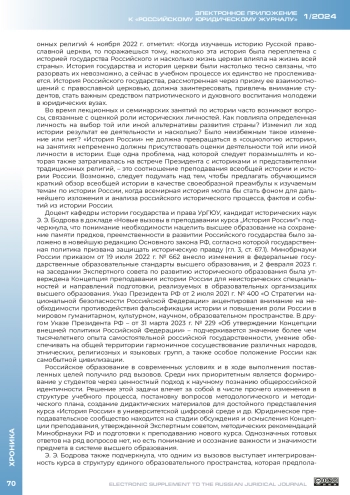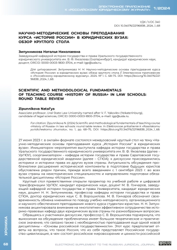 27 июня 2023 г. в онлайн-формате состоялся межвузовский круглый стол на тему «Научно-методические основы преподавания курса „История России“ в юридических вузах». Инициатором мероприятия выступила кафедра истории государства и права Уральского государственного юридического университета им. В. Ф. Яковлева (далее – УрГЮУ), соорганизатором – кафедра истории государства и права Саратовской государственной юридической академии (далее – СГЮА); к дискуссии присоединились историки и историки права из других вузов страны. Актуальность обсуждения проблематики расширения исторической компоненты в подготовке будущих юристов обусловлена рядом причин, прежде всего введением с 1 сентября 2023 г. во всех вузах страны на неисторических специальностях и направлениях подготовки обязательной дисциплины «История России».