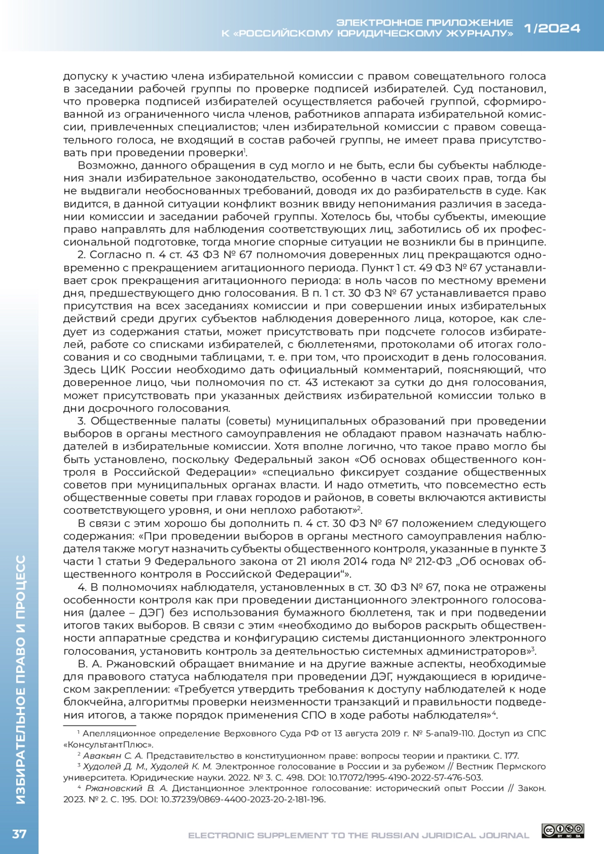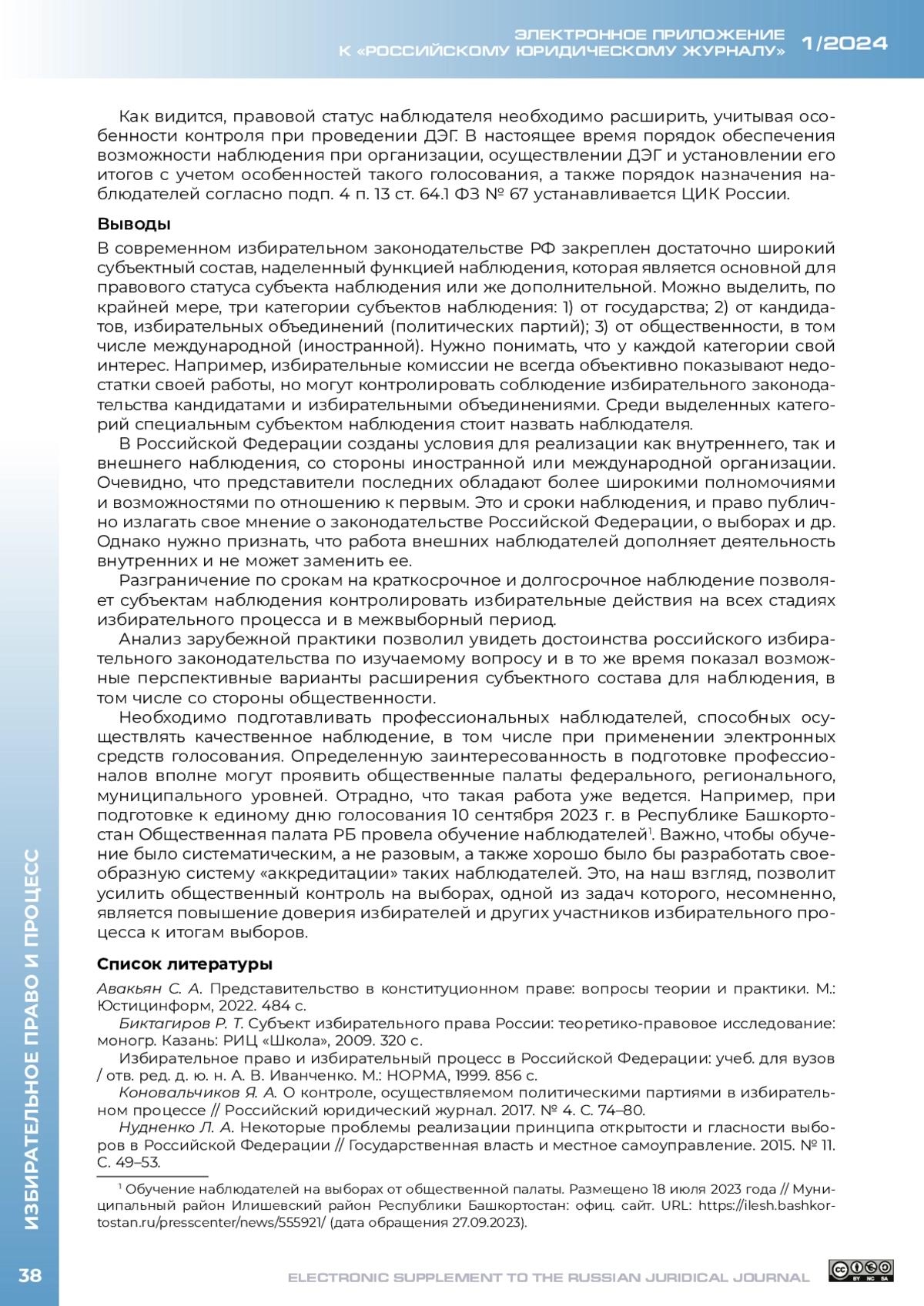 Наблюдение на выборах - неотъемлемая часть любой избирательной кампании, олицетворяющая принцип гласности и открытости организации и проведения выборов, - выступает одним из актуальных вопросов избирательного права. В избирательном законодательстве РФ закреплен достаточно широкий круг субъектов, наделенных функцией наблюдения, а по сути, контроля за осуществлением различных избирательных действий. Однако их статус различается по объему полномочий, срокам наблюдения. Цель статьи - на основе анализа избирательного законодательства и электоральной практики рассмотреть состав и полномочия субъектов, имеющих право осуществлять наблюдение на выборах, и внести предложения по совершенствованию избирательного законодательства РФ в данной сфере. Методологическую основу составили общенаучный диалектический метод познания социально-правовых явлений и вытекающие из него частнонаучные методы: формально-юридического анализа, наблюдения, историко-правовой, эмпирический, аналитический методы, позволившие использовать системный подход к изучению обозначенной проблемы. Рассмотрен состав субъектов, осуществляющих наблюдение на выборах по избирательному законодательству РФ. Выделено три категории субъектов наблюдения: 1) от государства; 2) от кандидатов, избирательных объединений (политических партий); 3) от общественности, в том числе международной (иностранной). Проведенное исследование позволило охарактеризовать субъектный состав уполномоченных осуществлять наблюдение на выборах, выявить пробелы и противоречия избирательного законодательства РФ в регулировании правового статуса данных лиц и внести предложения, способствующие совершенствованию норм избирательного законодательства. Анализ зарубежной практики позволил увидеть достоинства российского избирательного законодательства по изучаемому вопросу и в то же время показал возможные перспективные варианты расширения субъектного состава наблюдения, в том числе со стороны общественности.