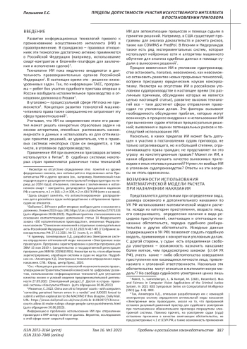 Статья: ПРЕДЕЛЫ ДОПУСТИМОСТИ УЧАСТИЯ ИСКУССТВЕННОГО ИНТЕЛЛЕКТА В ПОСТАНОВЛЕНИИ ПРИГОВОРА (2023)