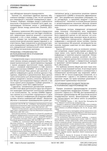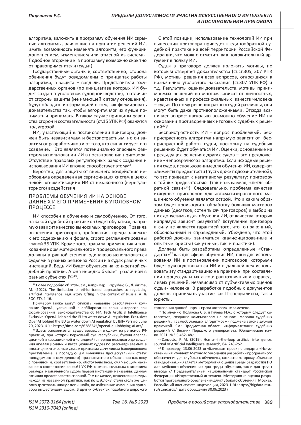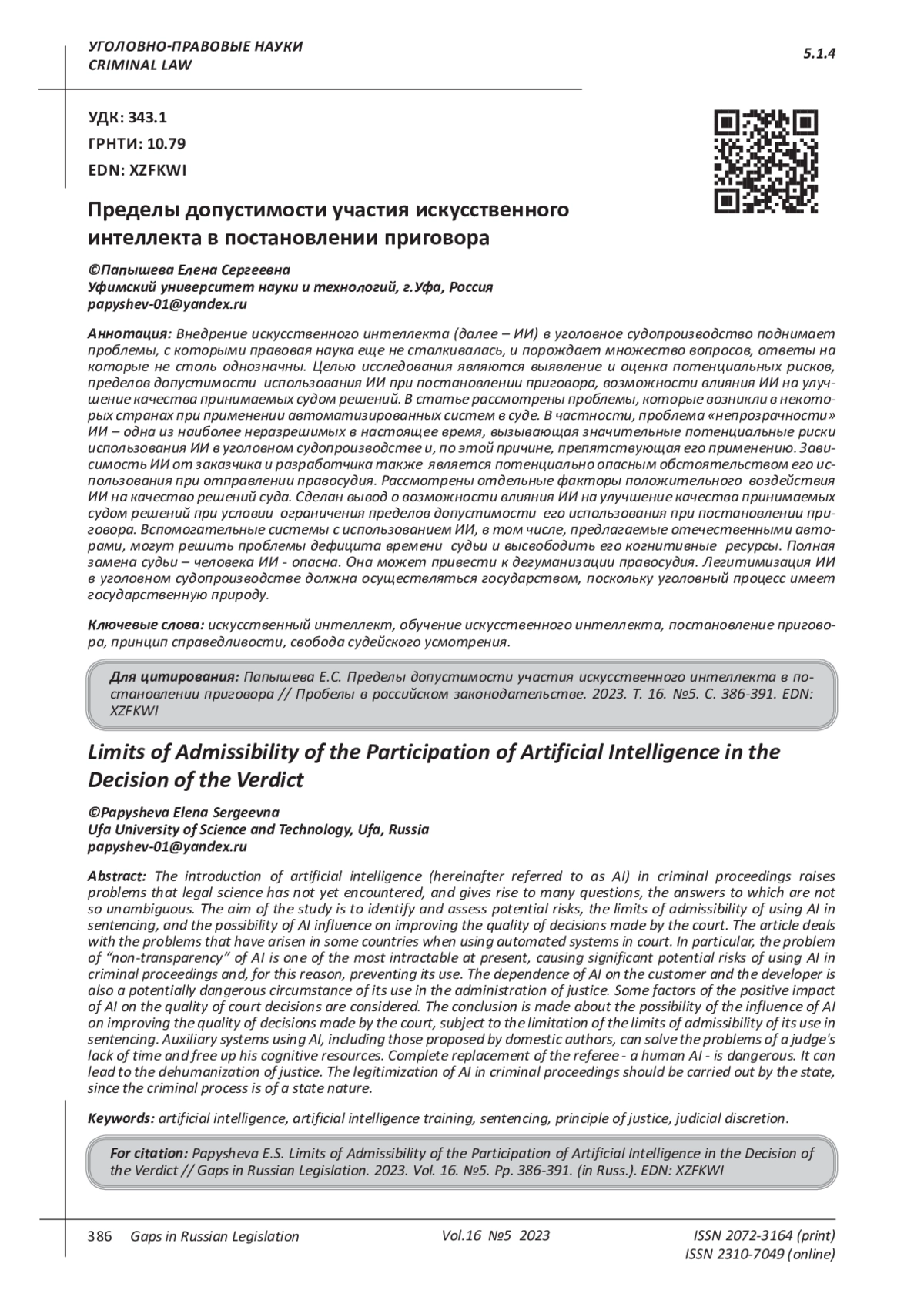 ЕЛЕНА С. П. ПРЕДЕЛЫ ДОПУСТИМОСТИ УЧАСТИЯ ИСКУССТВЕННОГО ИНТЕЛЛЕКТА В ПОСТАНОВЛЕНИИ ПРИГОВОРА // ПРОБЕЛЫ В РОССИЙСКОМ ЗАКОНОДАТЕЛЬСТВЕ. 2023. Т. 16 № 5