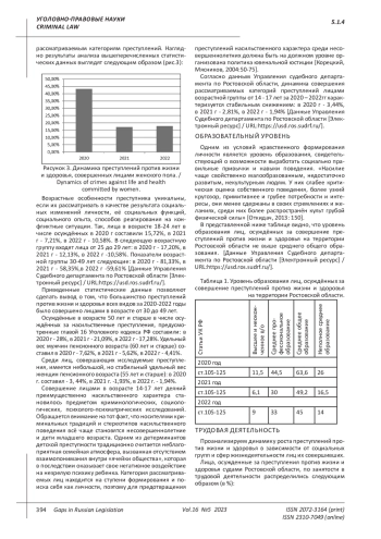 Цель исследования. Личностные качества и их связь интересуют криминалиста с тем, чтобы выяснить, какие именно «сдвиги» и «деформации» характерны для контингента преступников. Выявленные на репрезентативном статистическом материале данные о личности виновного могут стать значимым доказательством их причинной связи с механизмом следообразования. Цель исследования, таким образом, заключается в анализе наиболее важных элементов личности преступника, посягающего на жизнь и здоровье, знание о типовых качествах которого необходимы в процессе построения методики расследования преступлений соответствующей группы. Выводы. На основе анализа статистических данных о преступлениях против жизни и здоровья предложен типовой социально-демографический портрет виновного лица, определяющий направление дальнейшего совершенствования тактико-криминалистических рекомендаций и содержание алгоритма расследования преступлений данной категории. В этом находит предметное подтверждение комплексный характер вопроса изучения личности преступника, решение которых достигается путем интегрирования в криминалистику многих наук, в частности криминологии, социологии и психологии.