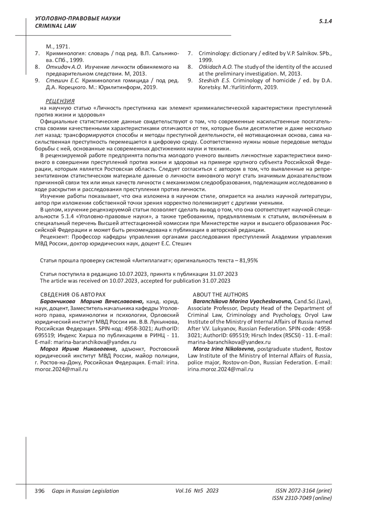 Steshich E.S. Criminology of homicide / ed. by D.A. Koretsky. M.: Yurlitinform, 2019.