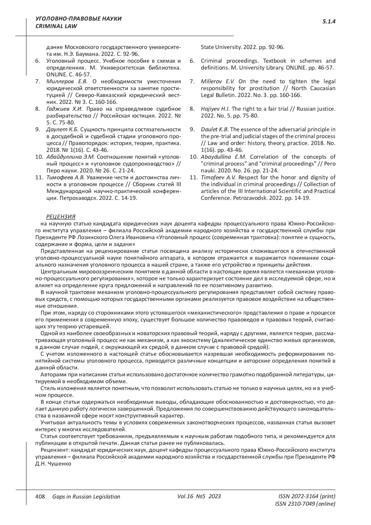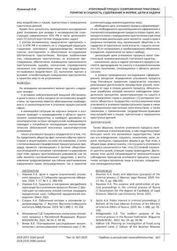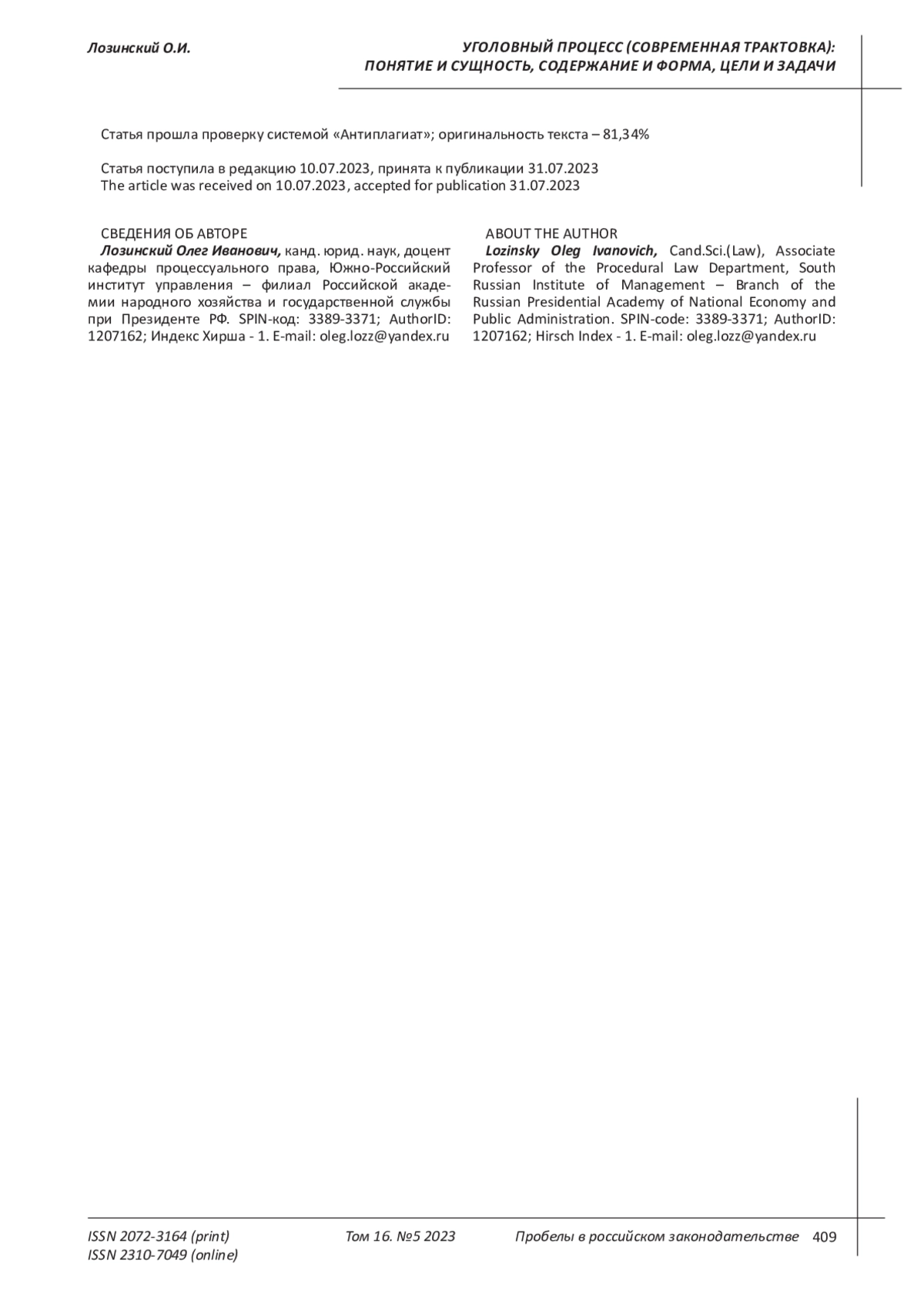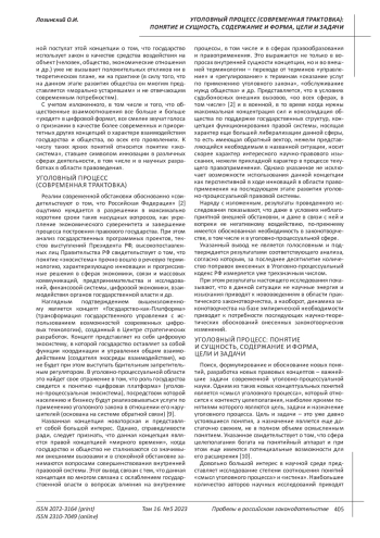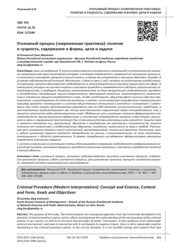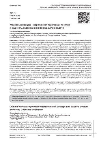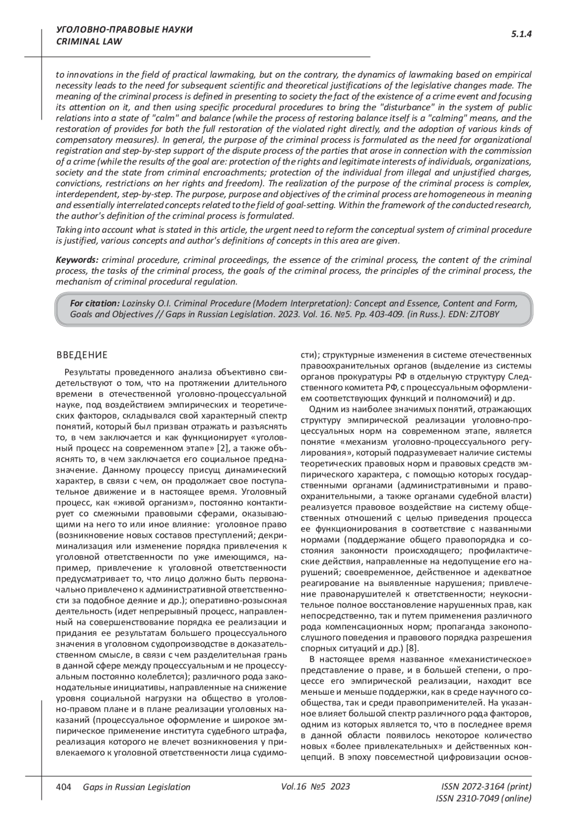 ЛОЗИНСКИЙ О. И. УГОЛОВНЫЙ ПРОЦЕСС (СОВРЕМЕННАЯ ТРАКТОВКА): ПОНЯТИЕ И СУЩНОСТЬ, СОДЕРЖАНИЕ И ФОРМА, ЦЕЛИ И ЗАДАЧИ // ПРОБЕЛЫ В РОССИЙСКОМ ЗАКОНОДАТЕЛЬСТВЕ. 2023. Т. 16 № 5