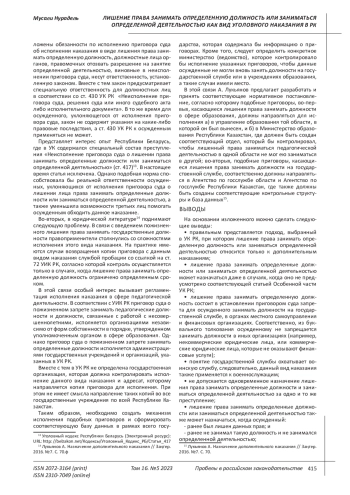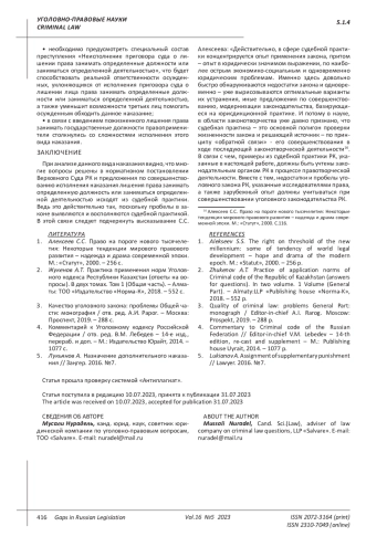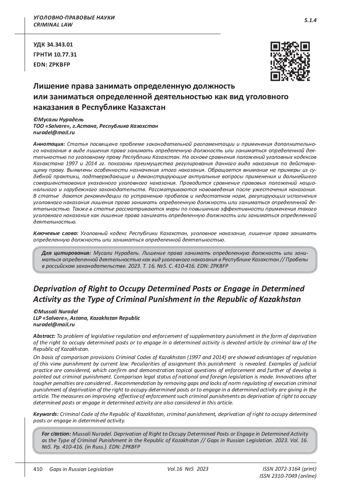 МУСАЛИ Н. ЛИШЕНИЕ ПРАВА ЗАНИМАТЬ ОПРЕДЕЛЕННУЮ ДОЛЖНОСТЬ ИЛИ ЗАНИМАТЬСЯ ОПРЕДЕЛЕННОЙ ДЕЯТЕЛЬНОСТЬЮ КАК ВИД УГОЛОВНОГО НАКАЗАНИЯ В РЕСПУБЛИКЕ КАЗАХСТАН // ПРОБЕЛЫ В РОССИЙСКОМ ЗАКОНОДАТЕЛЬСТВЕ. 2023. Т. 16 № 5