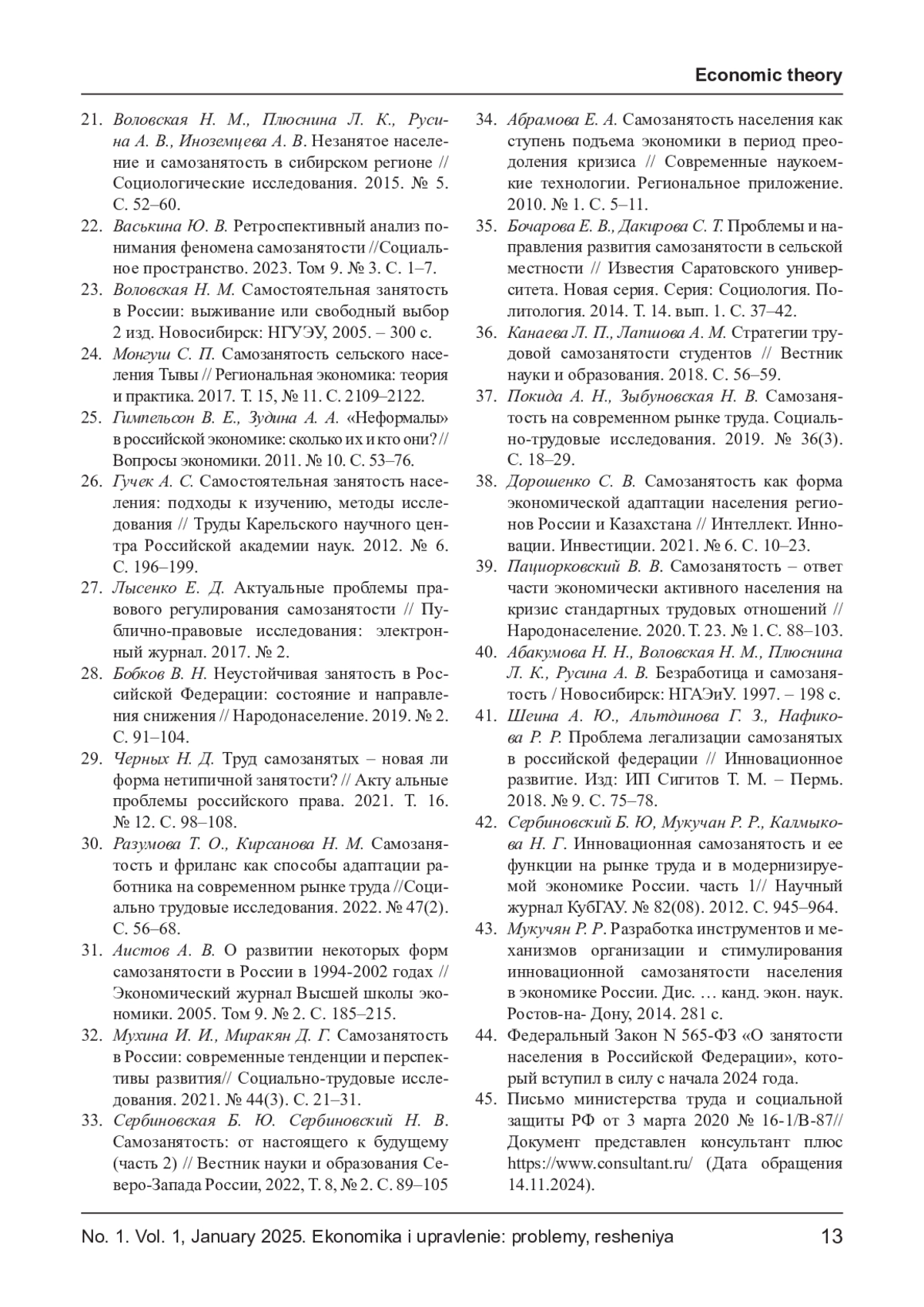 21. Воловская Н. М., Плюснина Л. К., Русина А. В., Иноземцева А. В. Незанятое население и самозанятость в сибирском регионе // Социологические исследования. 2015. № 5. С. 52-60. EDN: TUHQTX