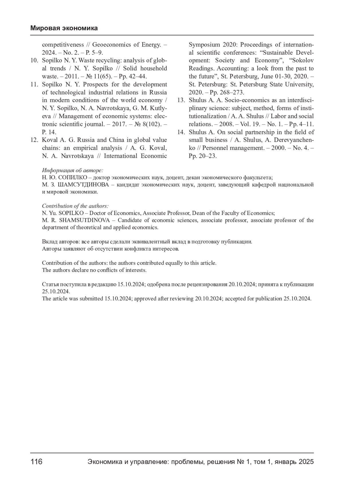 11. Сопилко Н. Ю. Перспективы развития технологичных производственных связей России в современных условиях мировой экономики / Н. Ю. Сопилко, Н. А. Навроцкая, Г. М. Кутлыева // Управление экономическими системами: электронный научный журнал. - 2017. - № 8(102). - С. 14. EDN: ZDMKIV