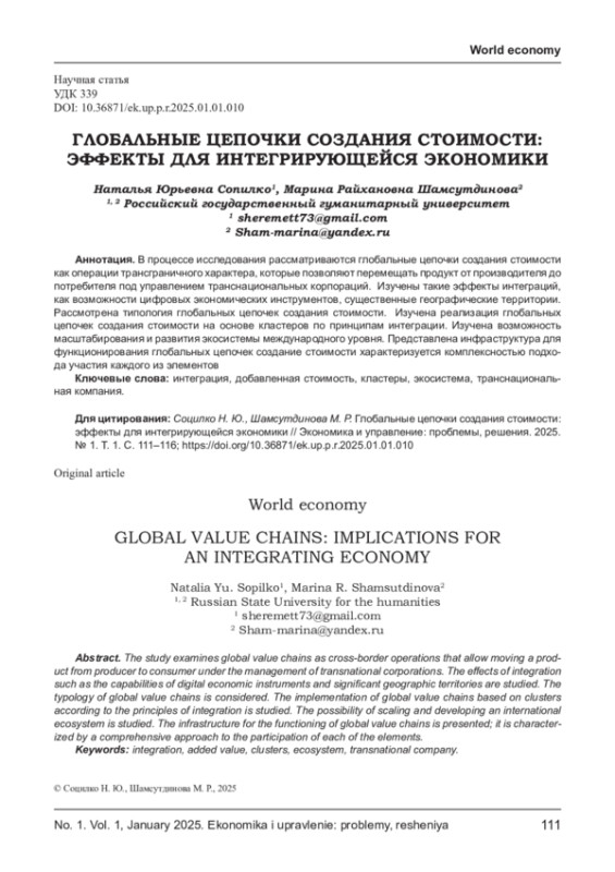 В процессе исследования рассматриваются глобальные цепочки создания стоимости как операции трансграничного характера, которые позволяют перемещать продукт от производителя до потребителя под управлением транснациональных корпораций. Изучены такие эффекты интеграций, как возможности цифровых экономических инструментов, существенные географические территории. Рассмотрена типология глобальных цепочек создания стоимости. Изучена реализация глобальных цепочек создания стоимости на основе кластеров по принципам интеграции. Изучена возможность масштабирования и развития экосистемы международного уровня. Представлена инфраструктура для функционирования глобальных цепочек создание стоимости характеризуется комплексностью подхода участия каждого из элементов.