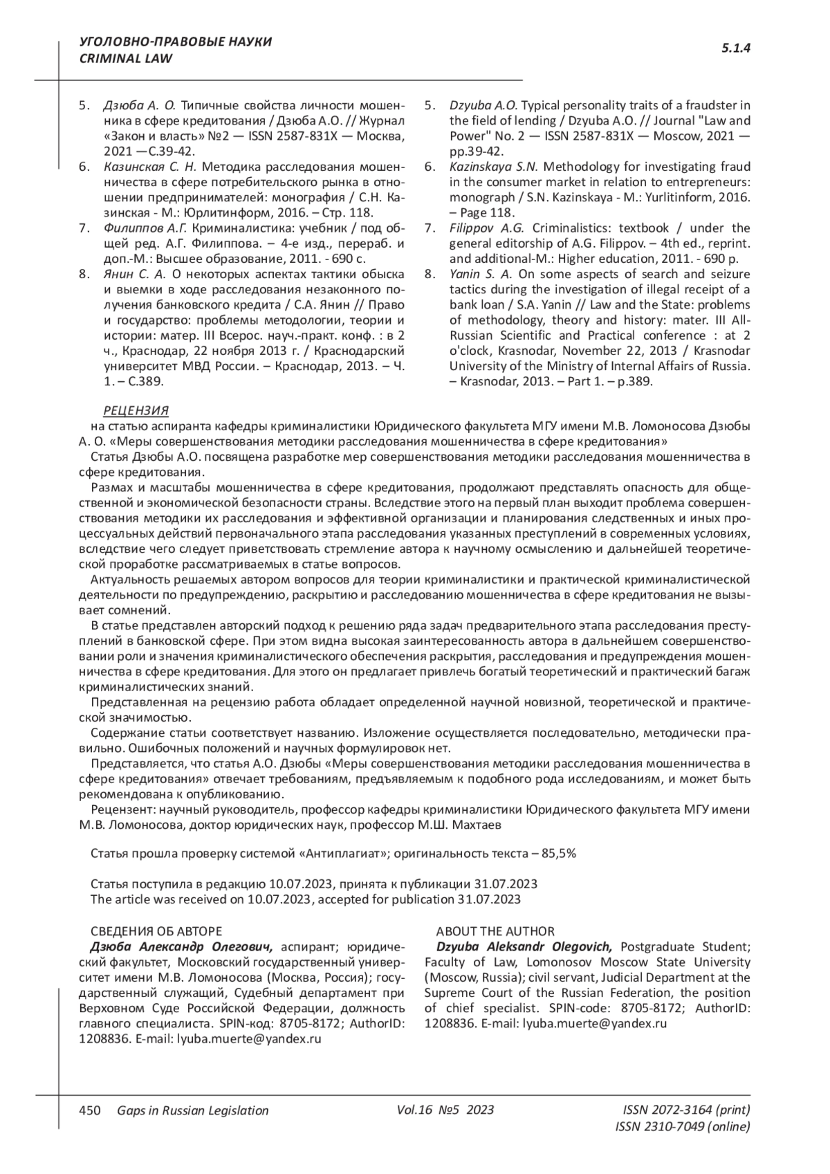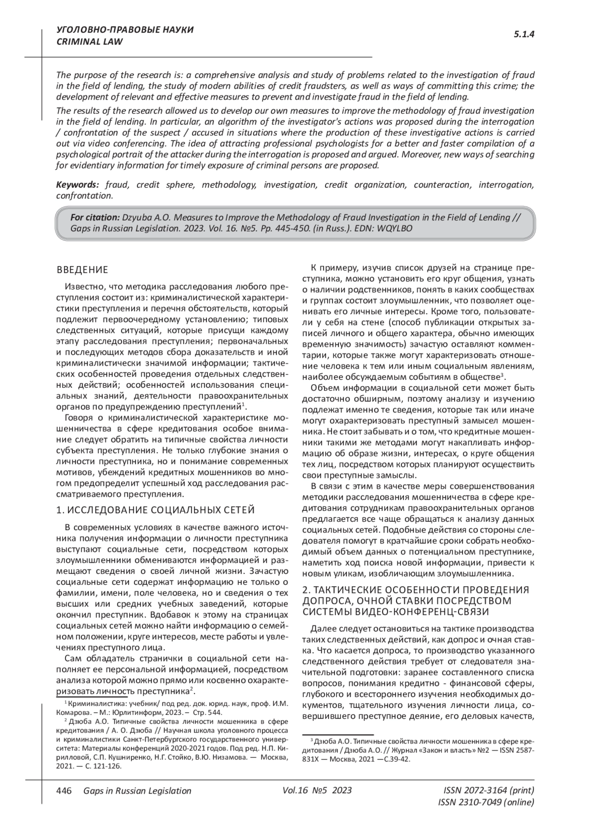 ДЗЮБА А. О. МЕРЫ СОВЕРШЕНСТВОВАНИЯ МЕТОДИКИ РАССЛЕДОВАНИЯ МОШЕННИЧЕСТВА В СФЕРЕ КРЕДИТОВАНИЯ // ПРОБЕЛЫ В РОССИЙСКОМ ЗАКОНОДАТЕЛЬСТВЕ. 2023. Т. 16 № 5