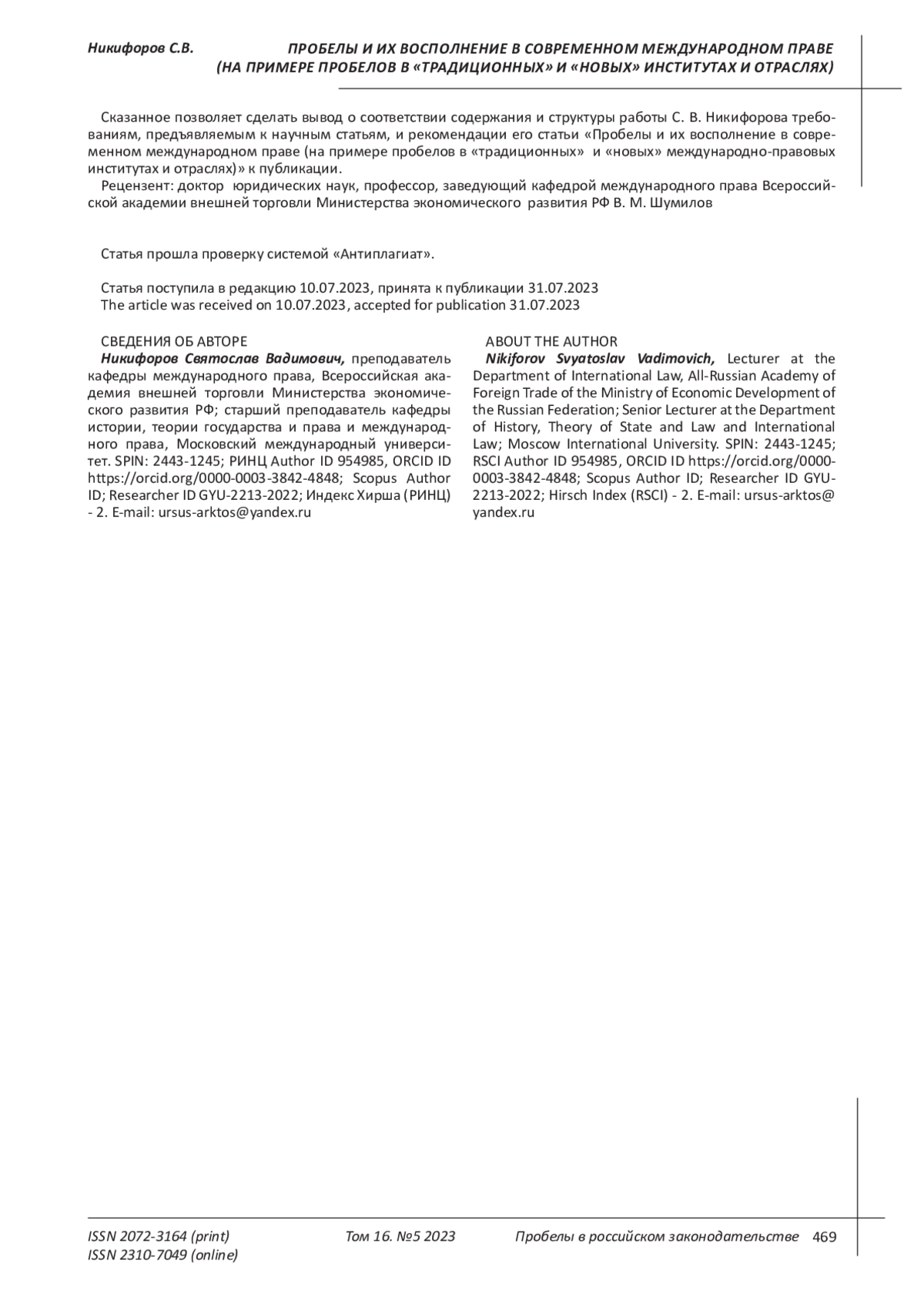 НИКИФОРОВ В. А. ПРОБЕЛЫ И ИХ ВОСПОЛНЕНИЕ В СОВРЕМЕННОМ МЕЖДУНАРОДНОМ ПРАВЕ (НА ПРИМЕРЕ ПРОБЕЛОВ В "ТРАДИЦИОННЫХ" И "НОВЫХ" МЕЖДУНАРОДНО-ПРАВОВЫХ ИНСТИТУТАХ И ОТРАСЛЯХ) // ПРОБЕЛЫ В РОССИЙСКОМ ЗАКОНОДАТЕЛЬСТВЕ. 2023. Т. 16 № 5