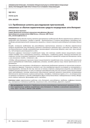 Целью данной статьи является рассмотрение особенностей сбыта наркотических средств посредством сети Интернет. Сегодня в тренде - бесконтактные. В статье рассмотрены популярные мессенджеры распространителей запрещенных веществ, а также сложности расследований категории данных дел. Выводы: основными проблемами при расследовании преступлений, связанных со сбытом наркотических средств посредством сети Интернет, являются электронные средства связи и расчетов. Как правило, такие бесконтактные способы взаимодействия минимизируют личностное общение, имен нет, лишь никнеймы, под которыми регистрируются в сети. Развитие цифровых технологий способствует тому, что платежи сегодня можно осуществить множеством способов: это и электронные кошельки, и биткоины, и кредитные карты. Большое количество иностранных систем позволяют проводить электронные денежные перевод без открытия банковского счета, к ним относятся «Anelik», «Uniastrum» и др. «Отбор» обслуживающего персонала также осуществляется посредством сети, поскольку для наркотиков нужна предпродажная подготовка, расфасовка, упаковка, закладка. Данные лица, также практически не пересекаются. Производители так называемых «дизайнерских» наркотиков предлагают огромное их количество на различных закрытых форумах. Сложность состоит в ом, что государство просто не успевает их отслеживать и регистрировать, поэтому до тех пор, пока они не попали в перечень запрещенных веществ, они абсолютно свободно распространяются, по сути не нарушая законодательства. Все эти аспекты существенно затрудняют расследование, поэтому практически единственной зацепкой являются технические составляющие деятельности преступников, а именно компьютеры, телефоны, платежные карты и т. п., по которым можно провести экспертизу и, хотя бы подтвердить факт поступления денег с подозрительных счетов, обнаружить тайные переписки, фотографии мест «закладок».