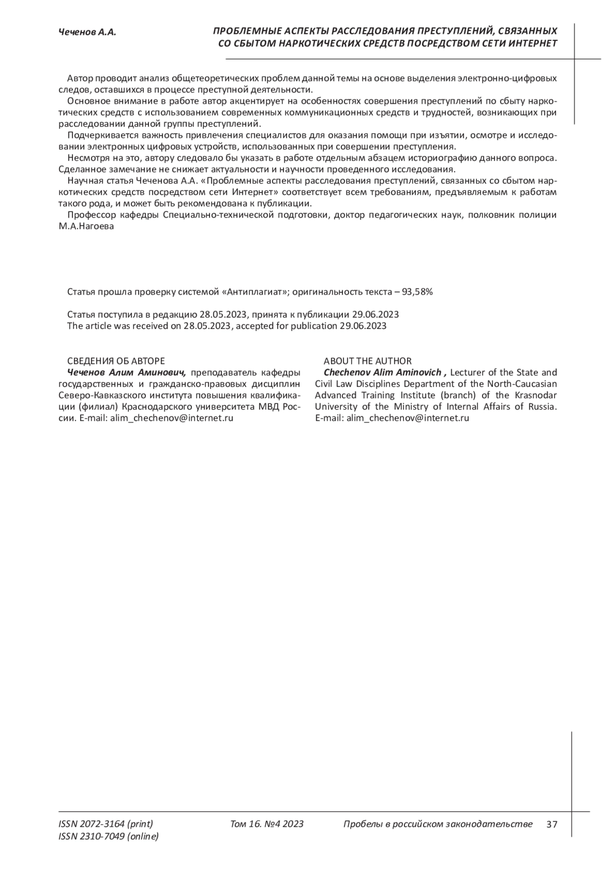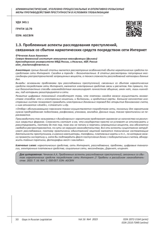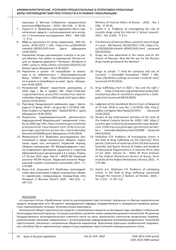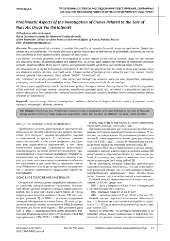 15. Яшин А.В., Шикшеев В.Р. Проблемы противодействия преступлениям в сфере незаконного оборота наркотиков, совершаемым посредством сети Интернет // Вестник ПензГУ. 2020. - №3 (31). - С. 107-112. EDN: NBICGL