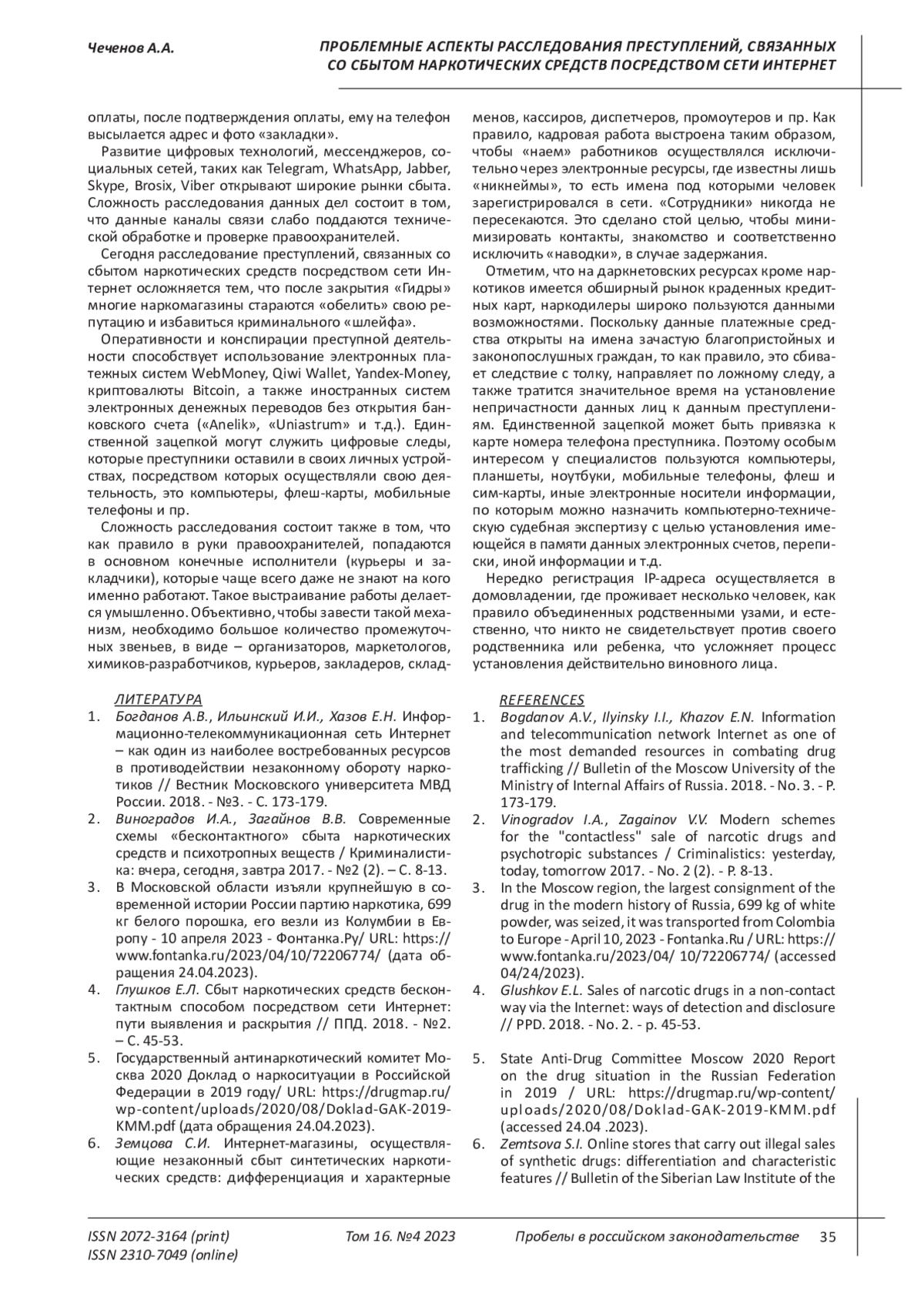 1. Богданов А.В., Ильинский И.И., Хазов Е.Н. Информационно-телекоммуникационная сеть Интернет - как один из наиболее востребованных ресурсов в противодействии незаконному обороту наркотиков // Вестник Московского университета МВД России. 2018. - №3. - С. 173-179. EDN: XUMKYX