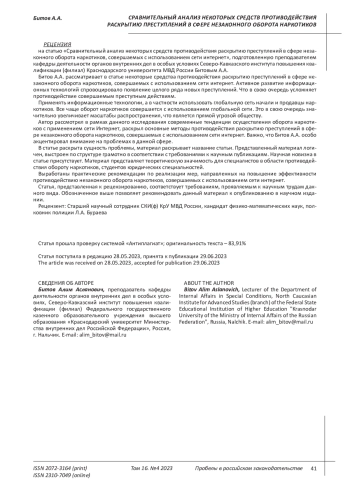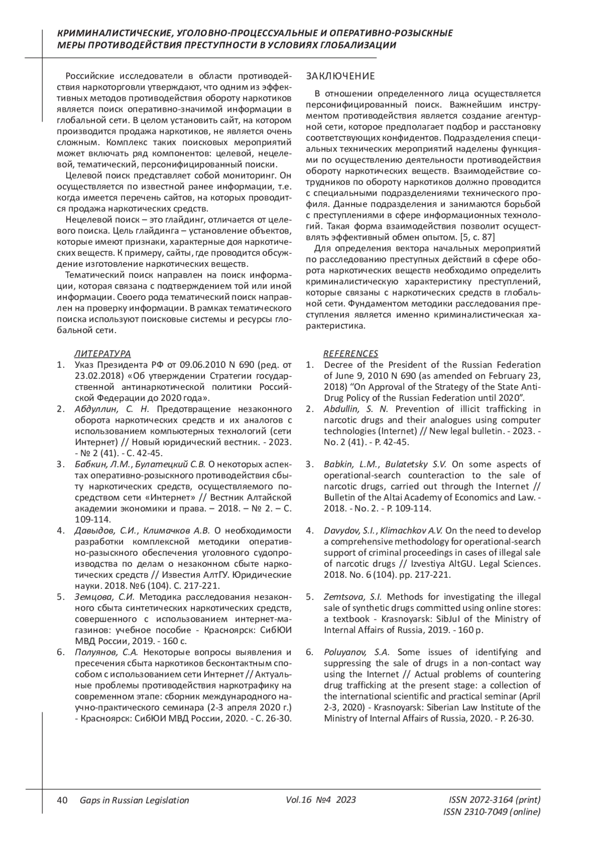 2. Абдуллин, С. Н. Предотвращение незаконного оборота наркотических средств и их аналогов с использованием компьютерных технологий (сети Интернет) // Новый юридический вестник. - 2023. - № 2 (41). - С. 42-45. EDN: IQTODU