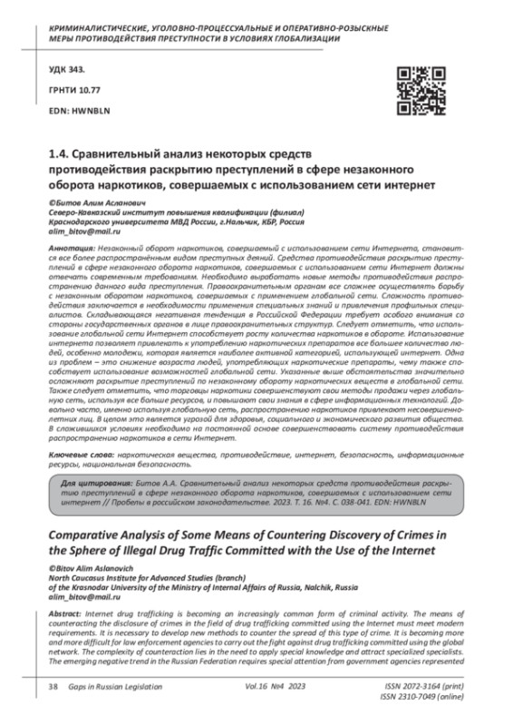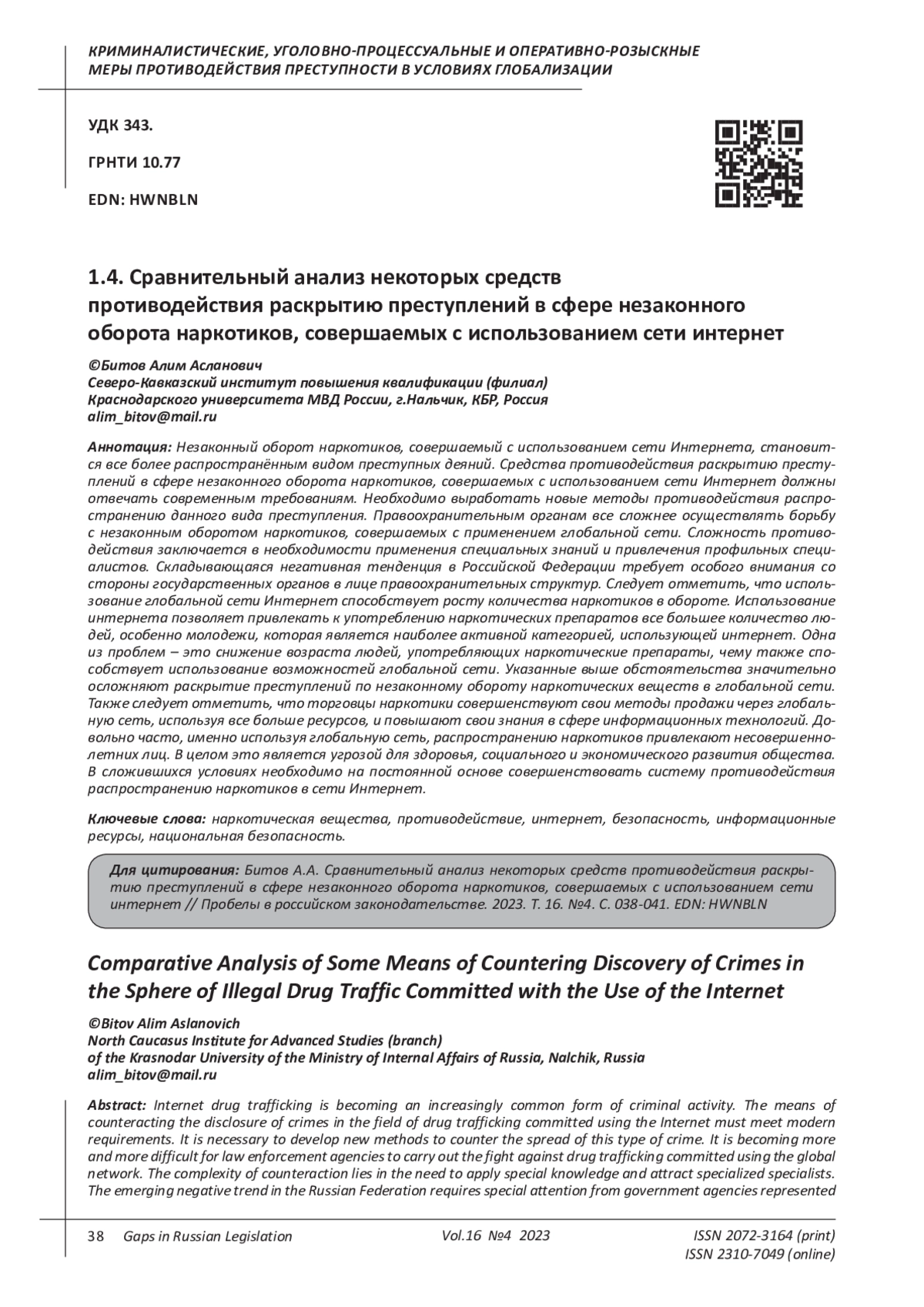 Abdullin, S. N. Prevention of illicit trafficking in narcotic drugs and their analogues using computer technologies (Internet) // New legal bulletin. - 2023. - No. 2 (41). - P. 42-45.