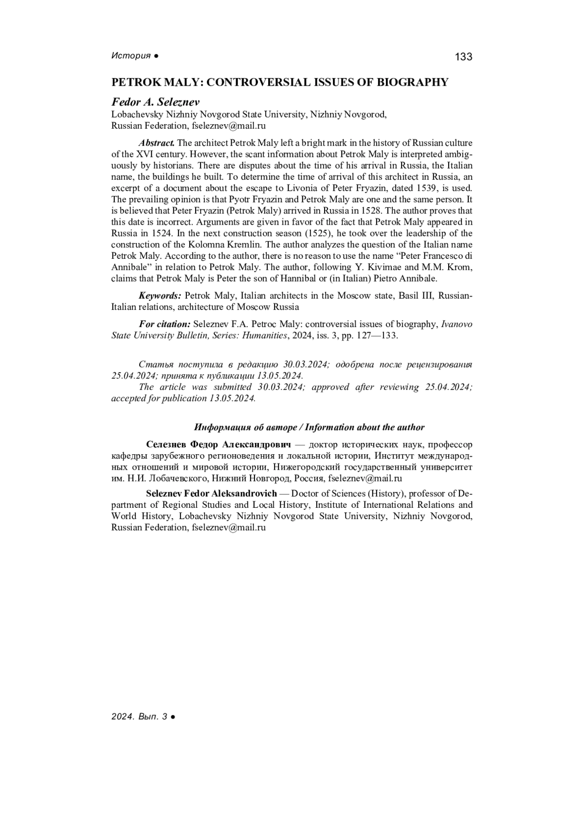 СЕЛЕЗНЕВ Ф. А. ПЕТРОК МАЛОЙ: СПОРНЫЕ ВОПРОСЫ БИОГРАФИИ // ВЕСТНИК ИВАНОВСКОГО ГОСУДАРСТВЕННОГО УНИВЕРСИТЕТА. СЕРИЯ: ГУМАНИТАРНЫЕ НАУКИ. 2024. № 3