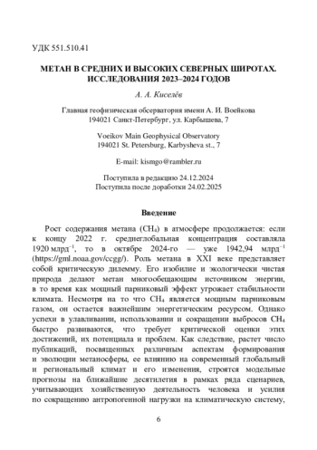 10. Киселёв А. А. (2023). Метан в средних и высоких северных широтах. Исследования 2018-2023 гг. // Труды ГГО. Вып. 609. С. 7-52.
