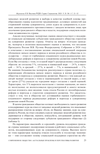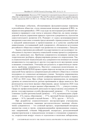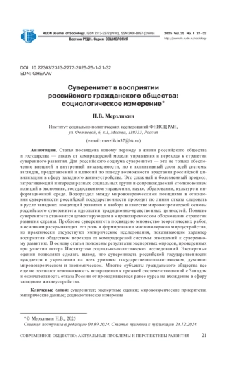 Статья посвящена новому периоду в жизни российского общества и государства - отказу от компрадорской модели управления и переходу к стратегии суверенного развития. Для российского социума суверенитет - это не только обеспечение внешней и внутренней независимости, но и когнитивный слом всей системы взглядов, представлений и иллюзий по поводу возможности врастания российской цивилизации в сферу западного жизнеустройства. Это сложный и болезненный процесс, затрагивающий интересы разных социальных групп и сопровождаемый столкновением позиций в экономике, государственном управлении, науке, образовании, культуре и информационной среде. Водораздел между мировоззренческими позициями в отношении суверенности российской государственности проходит по линии отказа следовать в русле западных концепций развития и выбора в качестве мировоззренческой основы российского суверенитета идеологии традиционно-нравственных ценностей. Понятие суверенитета становится цементирующим в мировоззренческом обосновании стратегии развития страны. Проблеме суверенитета посвящено множество теоретических работ, в основном раскрывающих его роль в формировании многополярного мироустройства, но практически отсутствуют эмпирические исследования, показывающие характер восприятия обществом перехода от компрадорской системы отношений к суверенному развитию. В основу статьи положены результаты экспертных опросов, проведенных при участии автора Институтом социально-политических исследований. Экспертные оценки позволяют сделать вывод, что суверенность российской государственности нуждается в укреплении на всех уровнях: государственно-политическом, духовно-мировоззренческом и экономическом. Многие субъекты гражданского общества все еще не осознают невозможность возвращения к прежней системе отношений с Западом и окончательность отказа России от проводившегося ранее курса на вхождение в сферу западного жизнеустройства.