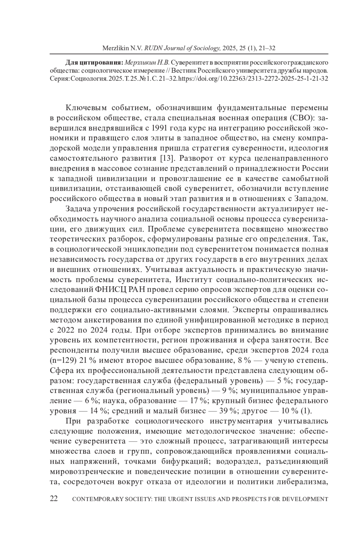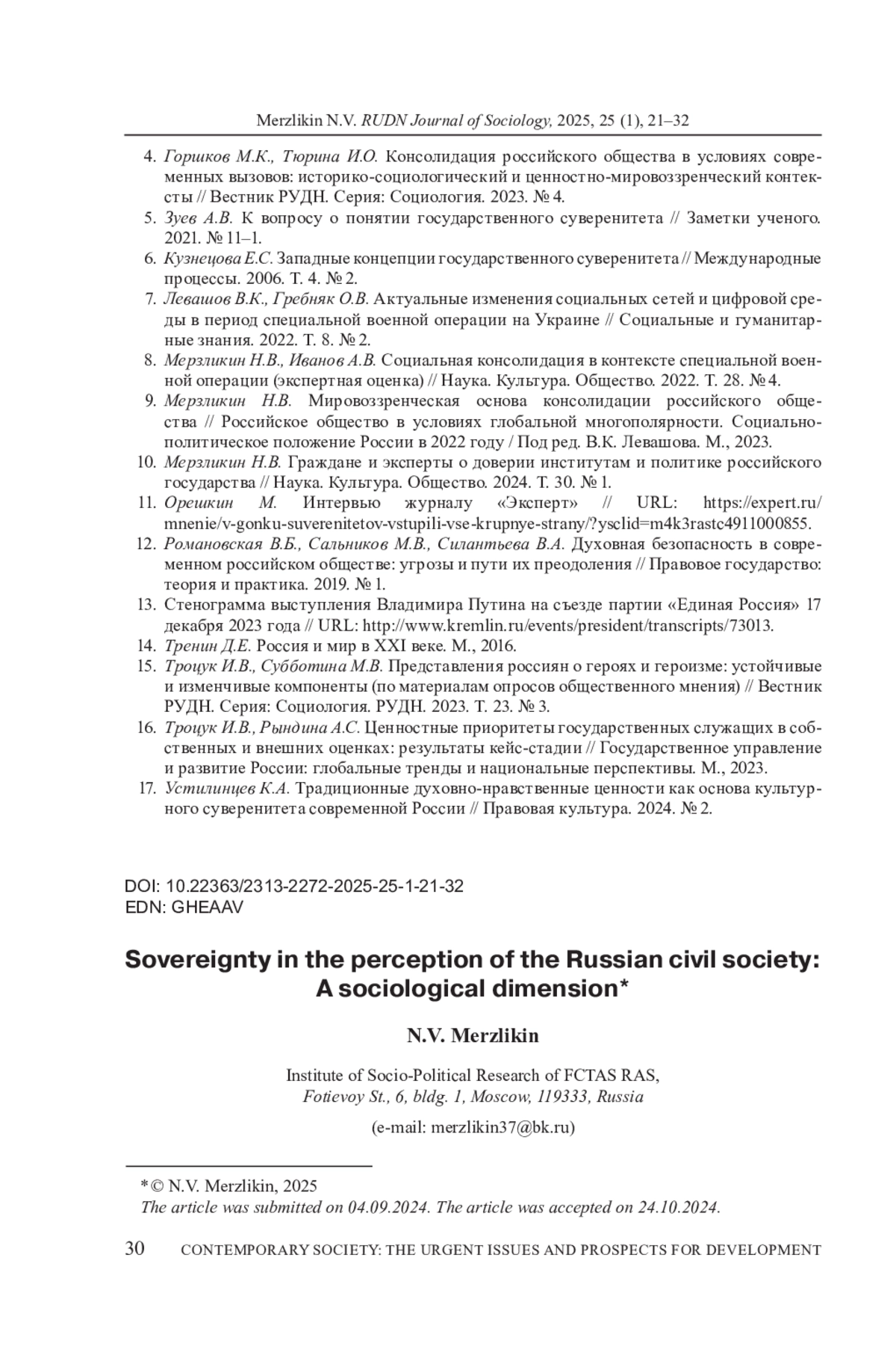 10. Мерзликин Н.В. Граждане и эксперты о доверии институтам и политике российского государства // Наука. Культура. Общество. 2024. Т. 30. № 1. EDN: ZRAWXD