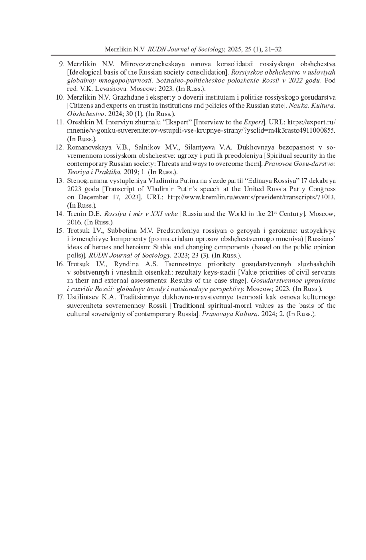 9. Мерзликин Н.В. Мировоззренческая основа консолидации российского общества // Российское общество в условиях глобальной многополярности. Социально-политическое положение России в 2022 году / Под ред. В.К. Левашова. М., 2023.