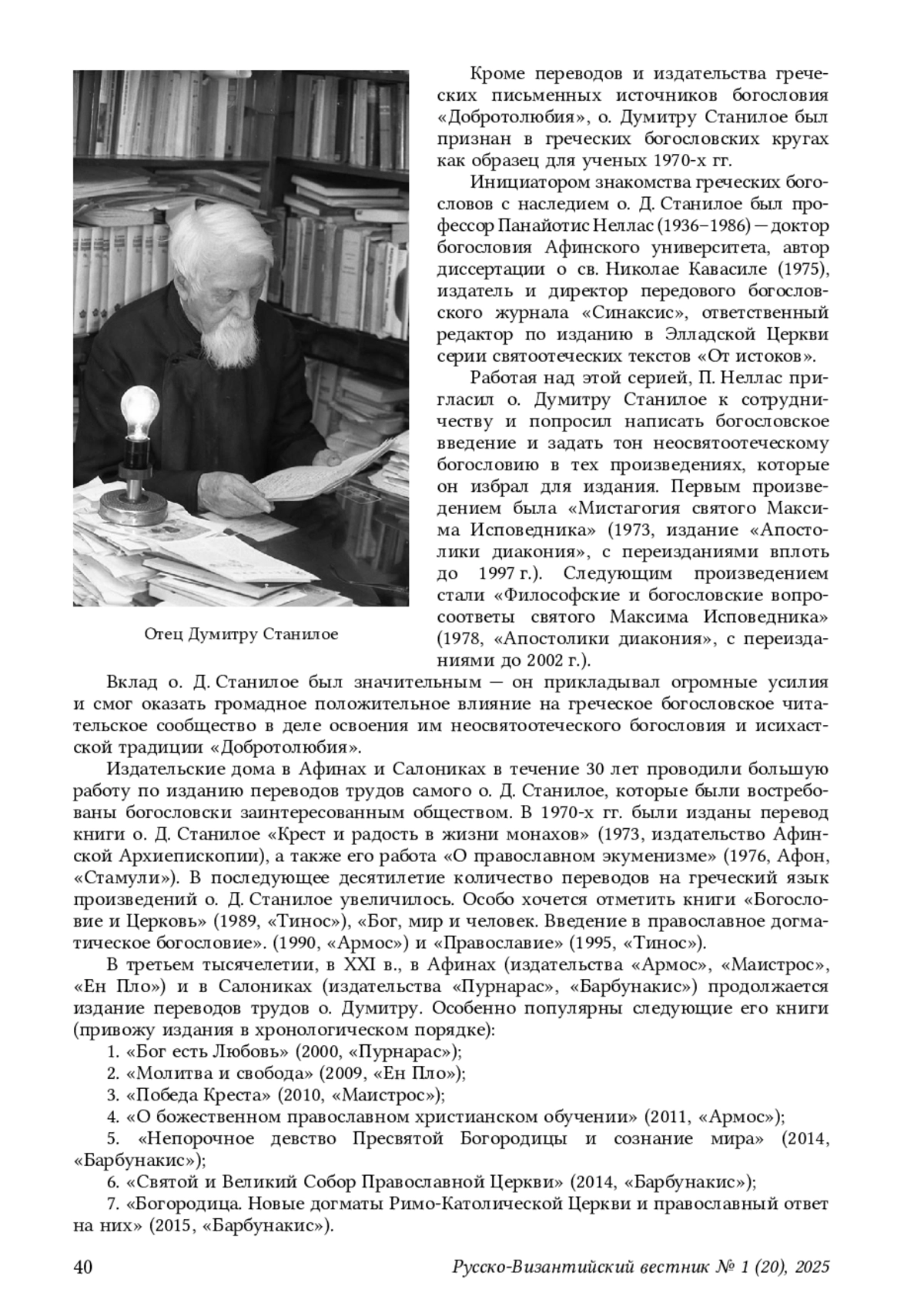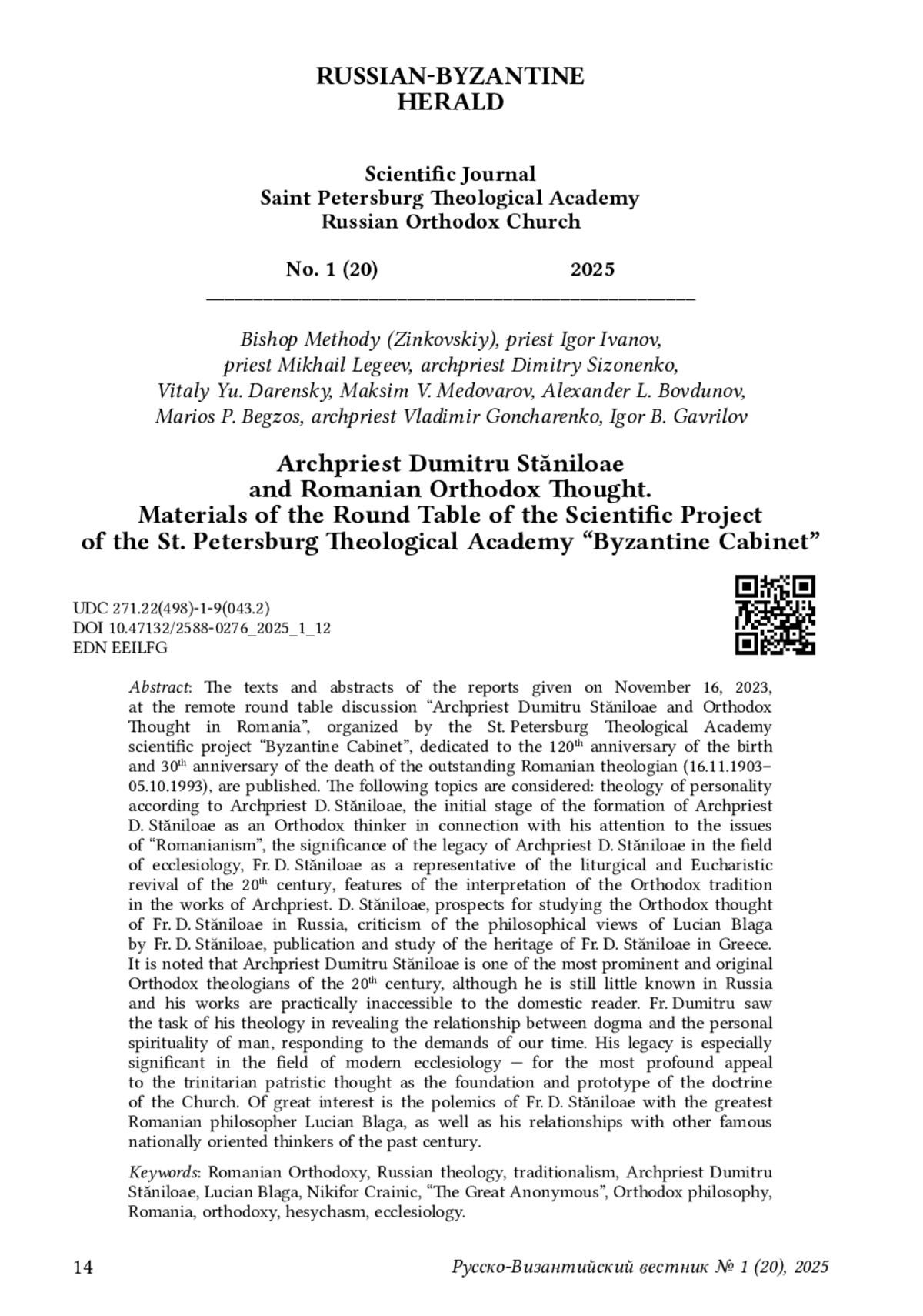 ЗИНКОВСКИЙ С. А., ИВАНОВ И. А., ЛЕГЕЕВ М. В., СИЗОНЕНКО Д. В., ДАРЕНСКИЙ В. Ю., МЕДОВАРОВ М. В., БОВДУНОВ А. Л., БЕГЗОС М. П., ГОНЧАРЕНКО В. В., ГАВРИЛОВ И. Б. ПРОТОИЕРЕЙ ДУМИТРУ СТАНИЛОЕ И РУМЫНСКАЯ ПРАВОСЛАВНАЯ МЫСЛЬ. МАТЕРИАЛЫ КРУГЛОГО СТОЛА НАУЧНОГО ПРОЕКТА СПБДА «ВИЗАНТИЙСКИЙ КАБИНЕТ» // РУССКО-ВИЗАНТИЙСКИЙ ВЕСТНИК. 2025. № 1 (20)