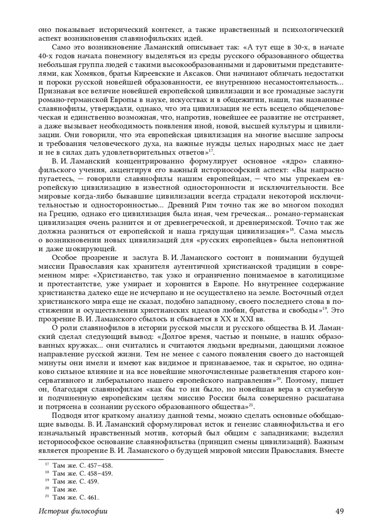 В наследии В. И. Ламанского, кроме концептуализации славянского «мира» как особого цивилизационного пространства, важное место занимает и анализ возможностей формирования славянского цивилизационного сознания, без которого объединение и развитие этого «мира» является невозможным. Как уже отмечалось, «мировоззрение Ламанского было славянофильским… главную славянскую задачу Ламанский видел в „скорейшем пробуждении“ общеславянского сознания»1. В. И. Ламанский был славянофилом в самом буквальном смысле слова — его предметом было славянство в целом, а не только Россия как его средоточие. Изначально, как известно, само слово «славянофилы» было насмешливым прозвищем в «обществе», настроенном западнически, и лишь затем получило позитивный смысл. При этом первое поколение славянофилов — поколение Хомякова и Киреевского — было не столько славянофильским, сколько русофильским; славянство интересовало их лишь косвенно, как культурный «спутник» России. И только у В. И. Ламанского интерес перемещается именно на славянство в целом.