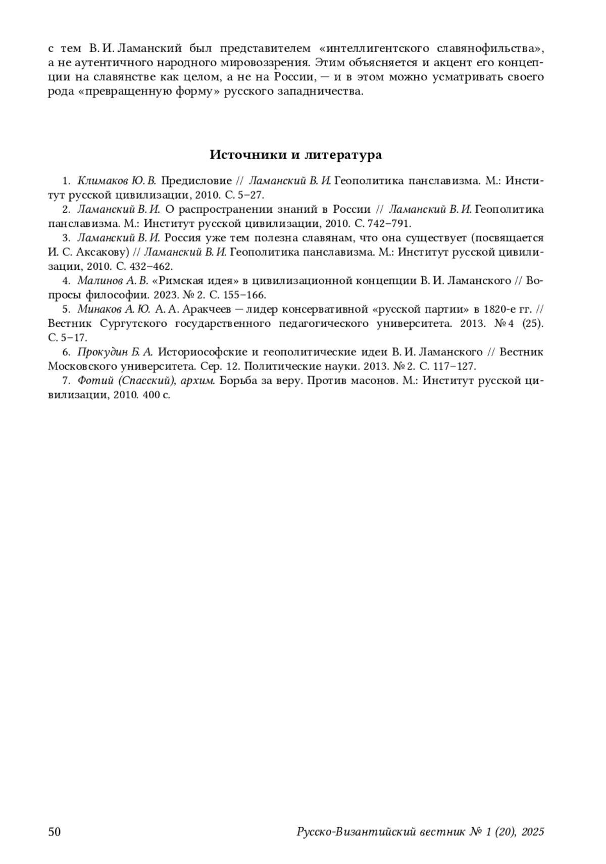 6. Прокудин Б. А. Историософские и геополитические идеи В. И. Ламанского // Вестник Московского университета. Сер. 12. Политические науки. 2013. № 2. С. 117-127. EDN: QAVHCX
