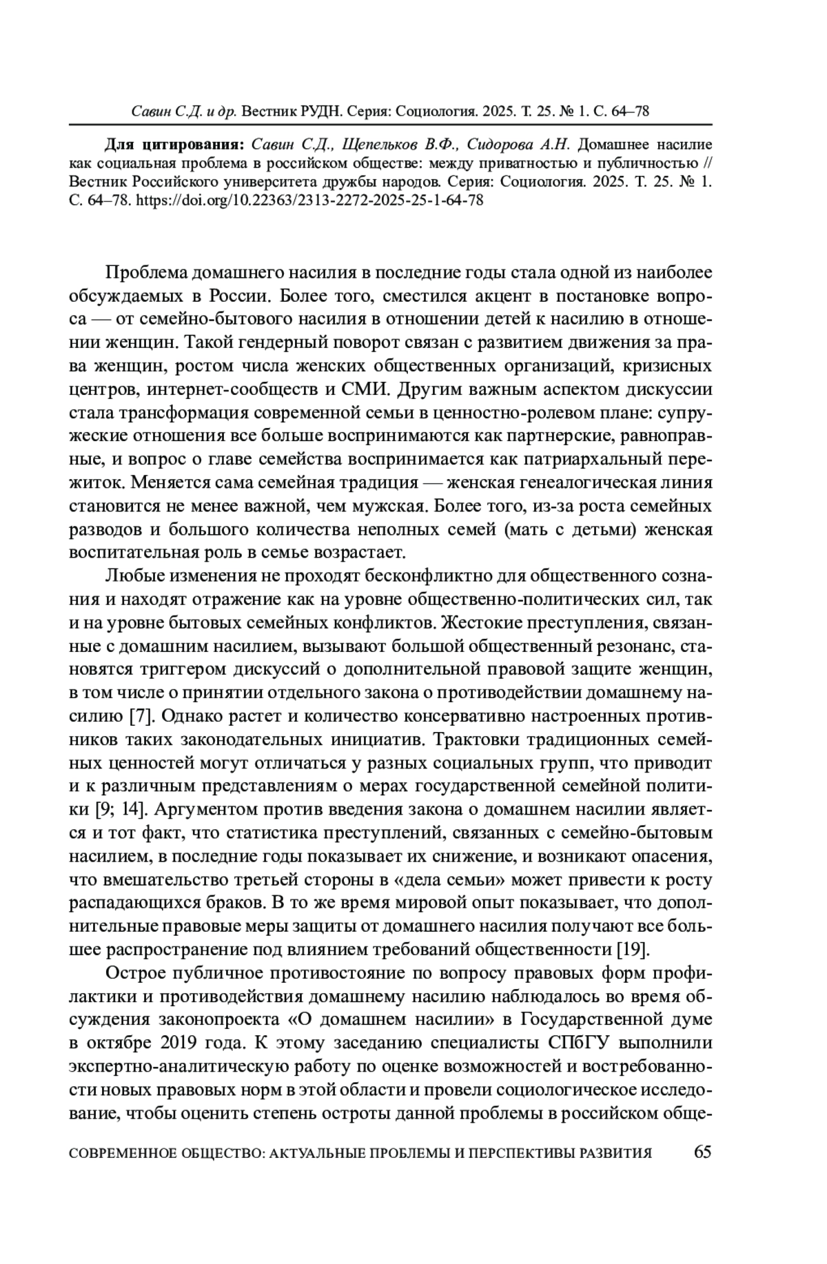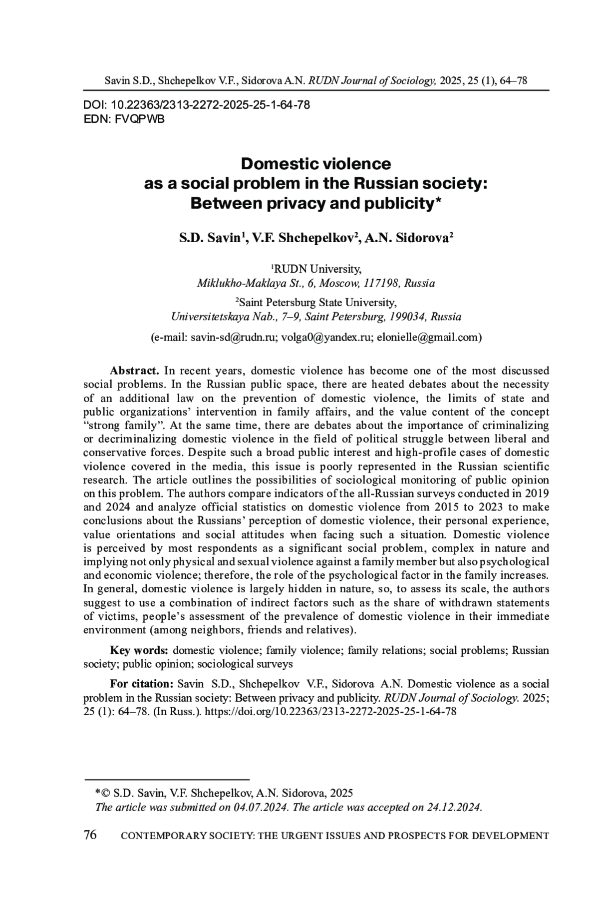 8. Ларина Т.И., Старостина А.А. Социокультурные особенности проблемы домашнего насилия в России // Общество: социология, психология, педагогика. 2023. № 6. EDN: XBDGUT