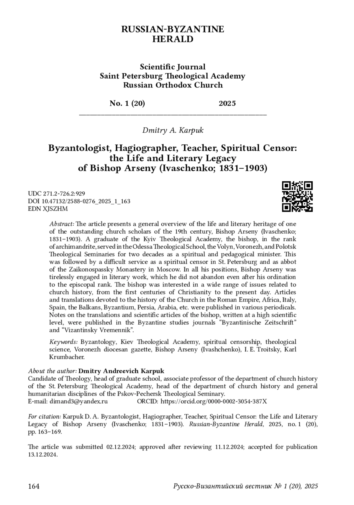 КАРПУК Д. А. ВИЗАНТОЛОГ, АГИОГРАФ, ПЕДАГОГ, ДУХОВНЫЙ ЦЕНЗОР: ЖИЗНЕННЫЙ ПУТЬ И ЛИТЕРАТУРНОЕ НАСЛЕДИЕ ЕПИСКОПА АРСЕНИЯ (ИВАЩЕНКО; 1831–1903) // РУССКО-ВИЗАНТИЙСКИЙ ВЕСТНИК. 2025. № 1 (20)