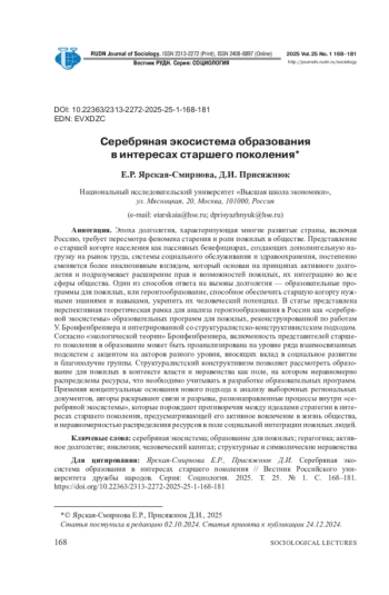Эпоха долголетия, характеризующая многие развитые страны, включая Россию, требует пересмотра феномена старения и роли пожилых в обществе. Представление о старшей когорте населения как пассивных бенефициарах, создающих дополнительную нагрузку на рынок труда, системы социального обслуживания и здравоохранения, постепенно сменяется более инклюзивным взглядом, который основан на принципах активного долголетия и подразумевает расширение прав и возможностей пожилых, их интеграцию во все сферы общества. Один из способов ответа на вызовы долголетия - образовательные программы для пожилых, или геронтообразование, способное обеспечить старшую когорту нужными знаниями и навыками, укрепить их человеческий потенциал. В статье представлена перспективная теоретическая рамка для анализа геронтообразования в России как «серебряной экосистемы» образовательных программ для пожилых, реконструированной по работам У. Бронфенбреннера и интегрированной со структуралистско-конструктивистским подходом. Согласно «экологической теории» Бронфенбреннера, включенность представителей старшего поколения в образование может быть проанализирована на уровне ряда взаимосвязанных подсистем с акцентом на акторов разного уровня, вносящих вклад в социальное развитие и благополучие группы. Структуралистский конструктивизм позволяет рассмотреть образование для пожилых в контексте власти и неравенства как поле, на котором неравномерно распределены ресурсы, что необходимо учитывать в разработке образовательных программ. Применяя концептуальные основания нового подхода к анализу выборочных региональных документов, авторы раскрывают связи и разрывы, разнонаправленные процессы внутри «серебряной экосистемы», которые порождают противоречия между идеалами стратегии в интересах старшего поколения, предусматривающей его активное вовлечение в жизнь общества, и неравномерностью распределения ресурсов в поле социальной интеграции пожилых людей.