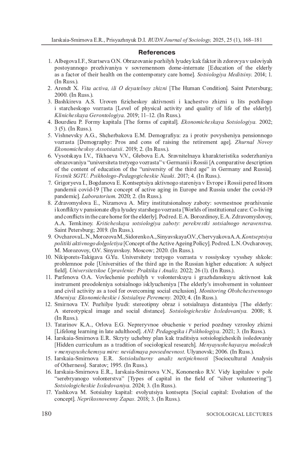 16. Ярская-Смирнова Е.Р., Ярская-Смирнова В.Н., Кононенко Р.В. Виды капиталов в поле “серебряного волонтерства” // Социологические исследования. 2024. № 3. EDN: KYDFML