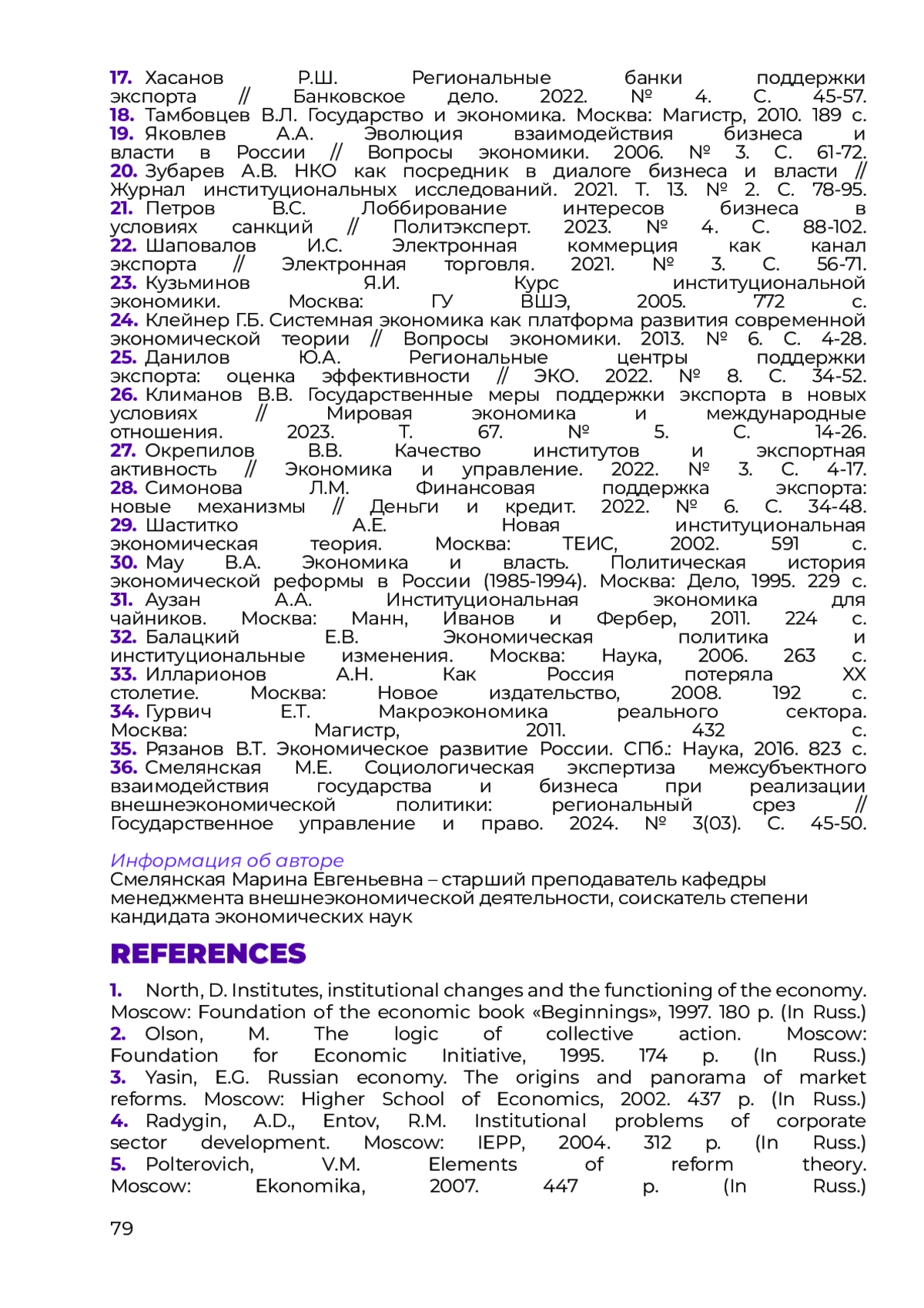 СМЕЛЯНСКАЯ М. Е. ВЗАИМОДЕЙСТВИЕ ГОСУДАРСТВА И БИЗНЕСА ПРИ РЕАЛИЗАЦИИ ВНЕШНЕЭКОНОМИЧЕСКОЙ ПОЛИТИКИ: МЕХАНИЗМЫ, ОБРАТНАЯ СВЯЗЬ, ОЦЕНКА ФУНКЦИОНИРОВАНИЯ // НАУЧНЫЙ ЖУРНАЛ "ГОСУДАРСТВЕННОЕ УПРАВЛЕНИЕ И ПРАВО". 2025. № 1 (5)