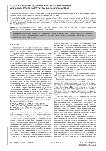 Статья: РОЛЬ САМОСТОЯТЕЛЬНОЙ ПОДГОТОВКИ ПО ДИСЦИПЛИНЕ "ФИЗИЧЕСКАЯ ПОДГОТОВКА" В ОБРАЗОВАТЕЛЬНЫХ ОРГАНИЗАЦИЯХ МВД РОССИИ (2023)