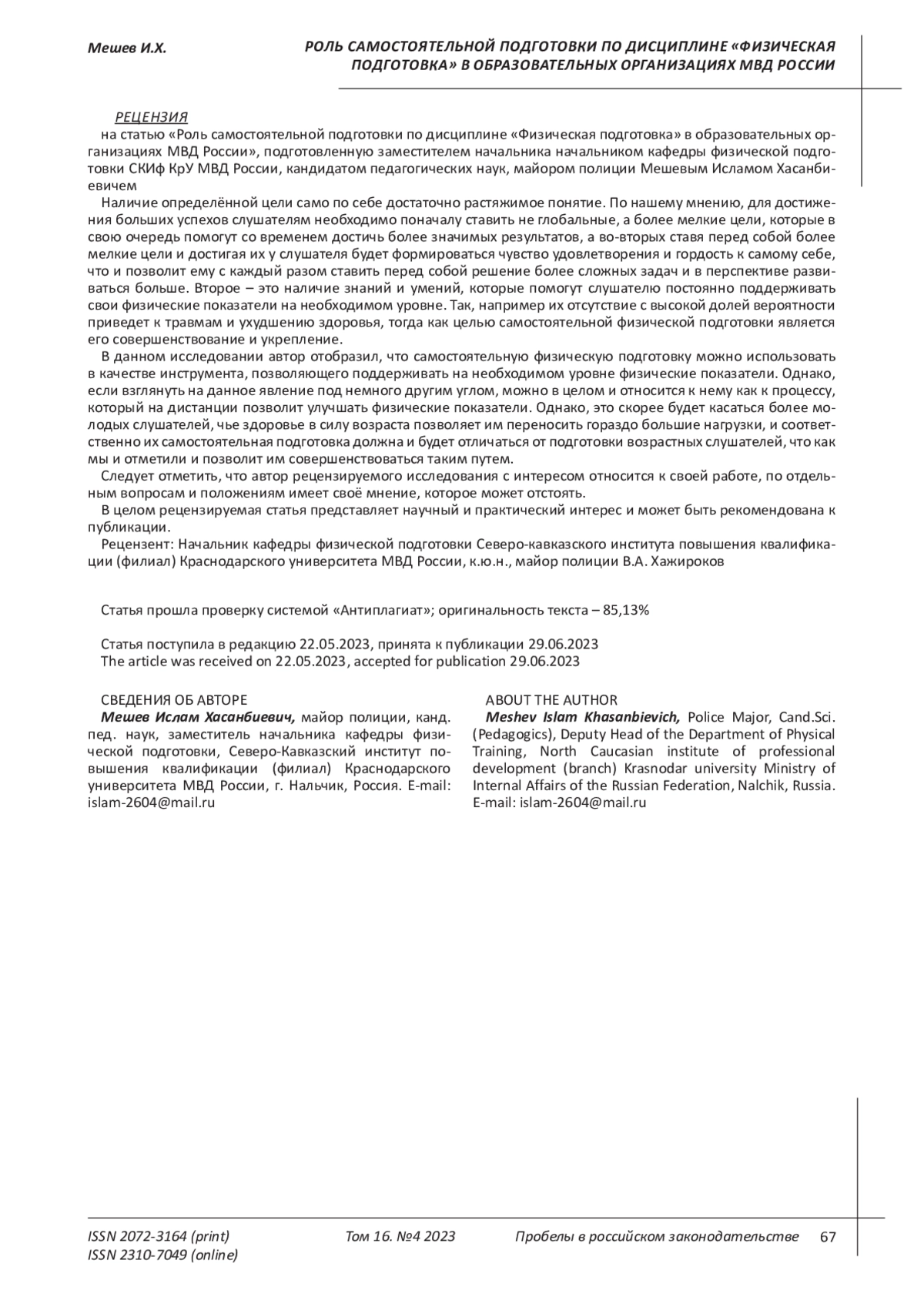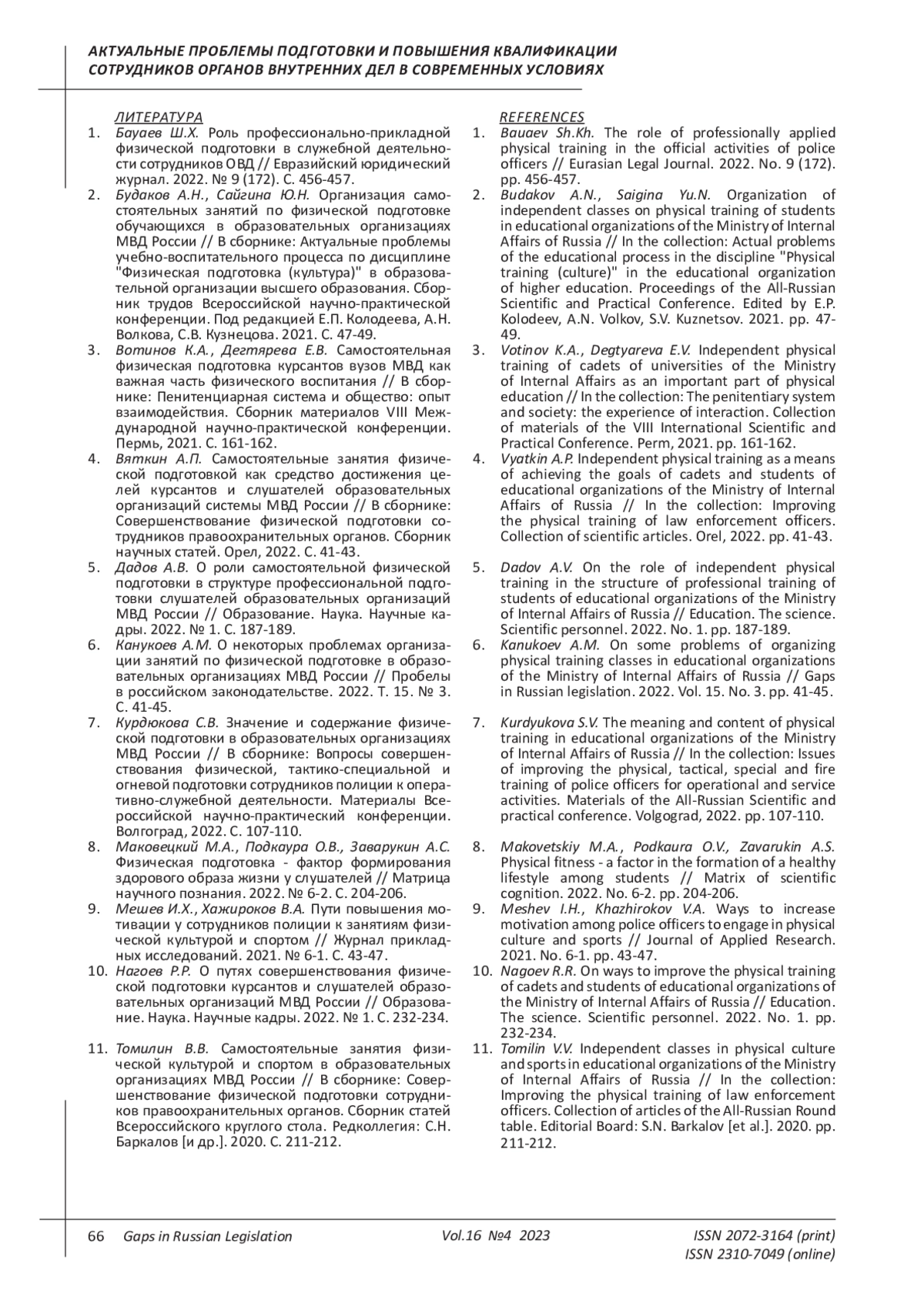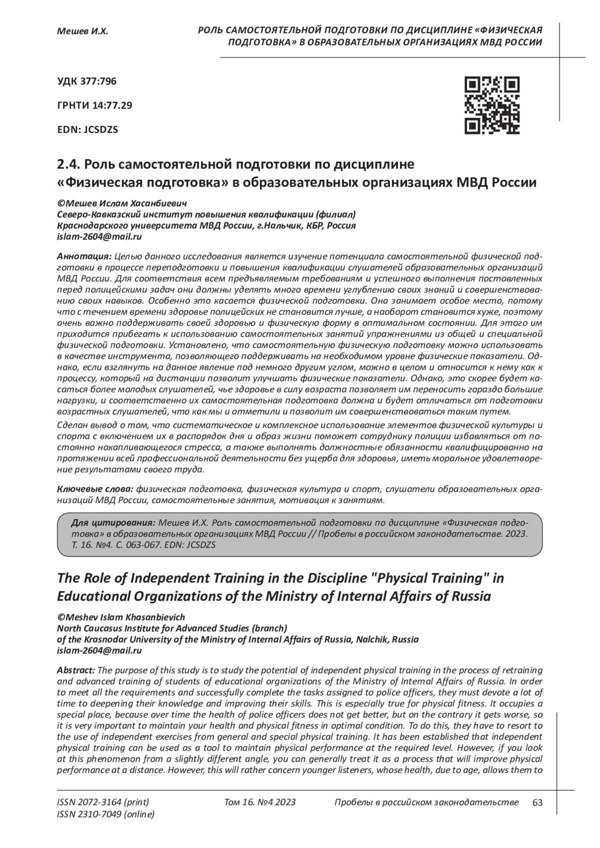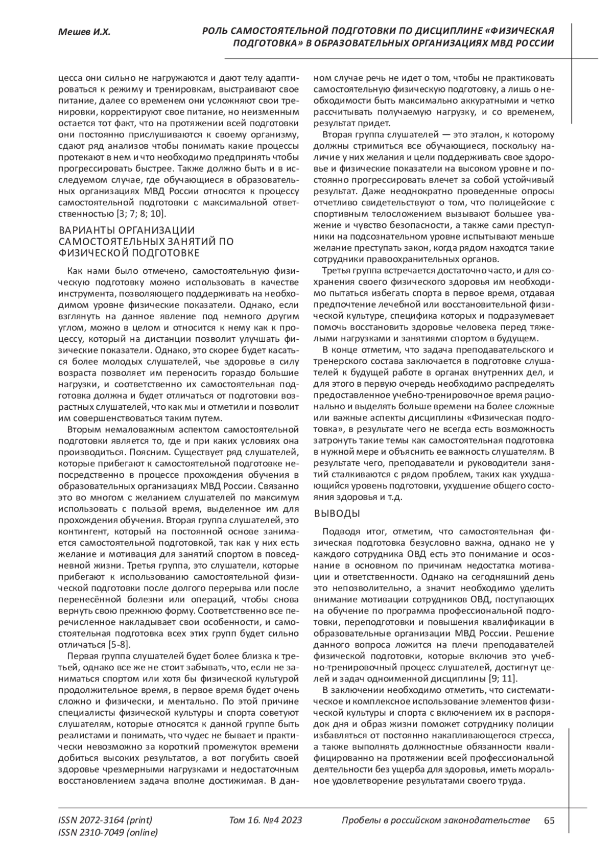 МЕШЕВ И. Х. РОЛЬ САМОСТОЯТЕЛЬНОЙ ПОДГОТОВКИ ПО ДИСЦИПЛИНЕ "ФИЗИЧЕСКАЯ ПОДГОТОВКА" В ОБРАЗОВАТЕЛЬНЫХ ОРГАНИЗАЦИЯХ МВД РОССИИ // ПРОБЕЛЫ В РОССИЙСКОМ ЗАКОНОДАТЕЛЬСТВЕ. 2023. Т. 16 № 4