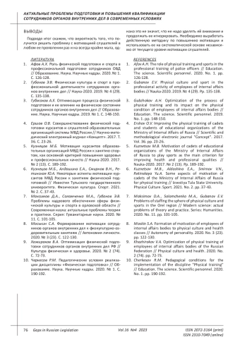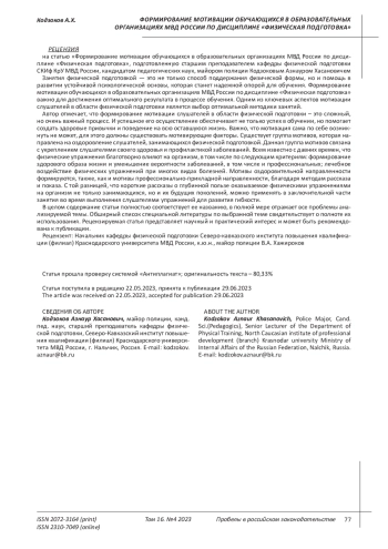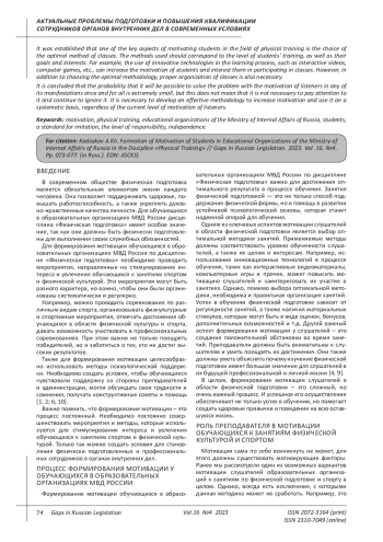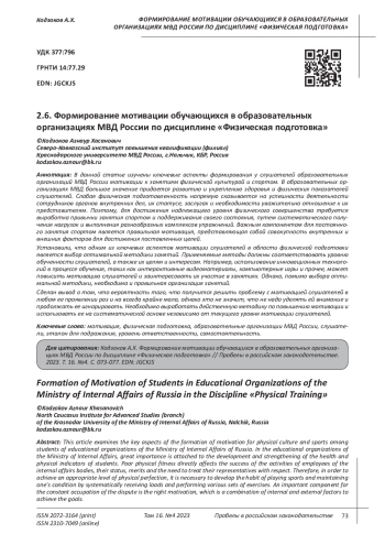 Статья: ФОРМИРОВАНИЕ МОТИВАЦИИ ОБУЧАЮЩИХСЯ В ОБРАЗОВАТЕЛЬНЫХ ОРГАНИЗАЦИЯХ МВД РОССИИ ПО ДИСЦИПЛИНЕ "ФИЗИЧЕСКАЯ ПОДГОТОВКА" (2023)