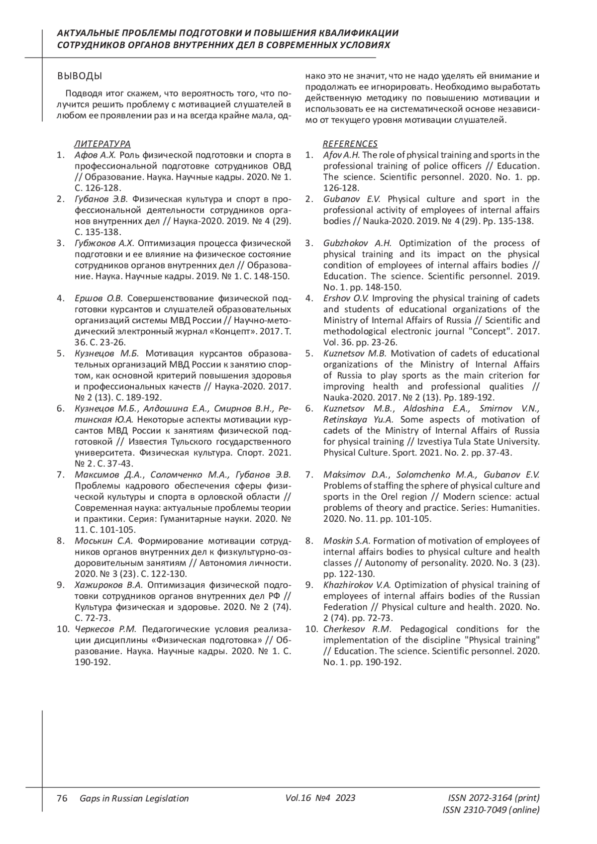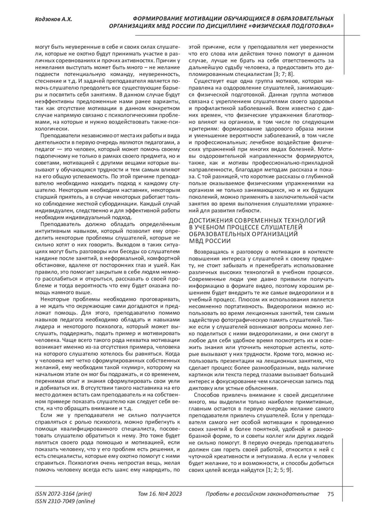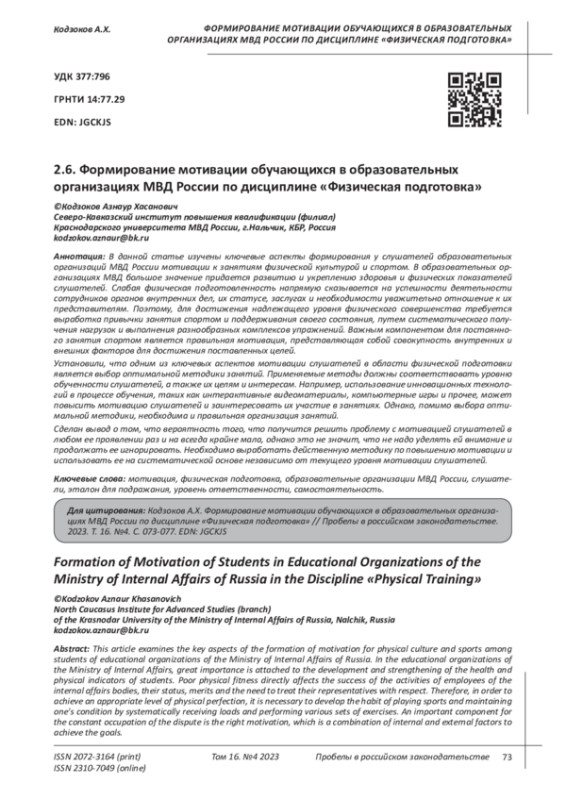 КОДЗОКОВ А. Х. ФОРМИРОВАНИЕ МОТИВАЦИИ ОБУЧАЮЩИХСЯ В ОБРАЗОВАТЕЛЬНЫХ ОРГАНИЗАЦИЯХ МВД РОССИИ ПО ДИСЦИПЛИНЕ "ФИЗИЧЕСКАЯ ПОДГОТОВКА" // ПРОБЕЛЫ В РОССИЙСКОМ ЗАКОНОДАТЕЛЬСТВЕ. 2023. Т. 16 № 4