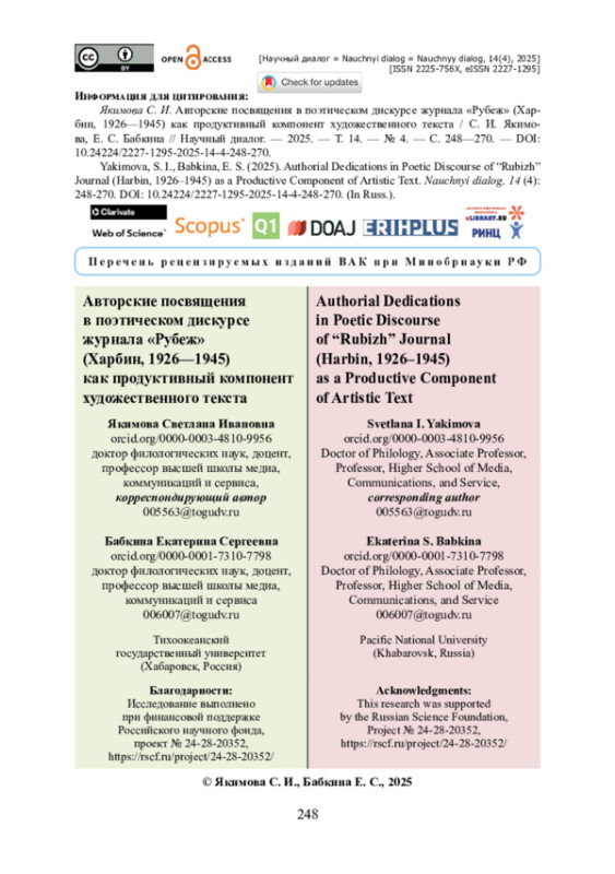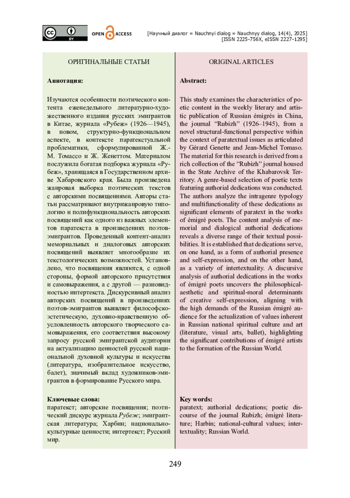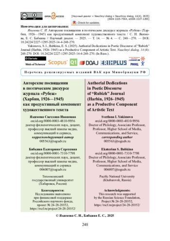 Изучаются особенности поэтического контента еженедельного литературно-художественного издания русских эмигрантов в Китае, журнала «Рубеж» (1926—1945), в новом, структурно-функциональном аспекте, в контексте паратекстуальной проблематики, сформулированной Ж.-М. Томассо и Ж. Женеттом. Материалом послужила богатая подборка журнала «Рубеж», хранящаяся в Государственном архиве Хабаровского края. Была произведена жанровая выборка поэтических текстов с авторскими посвящениями. Авторы статьи рассматривают внутрижанровую типологию и полифункциональность авторских посвящений как одного из важных элементов паратекста в произведениях поэтов-эмигрантов. Проведенный контент-анализ мемориальных и диалоговых авторских посвящений выявляет многообразие их текстологических возможностей. Установлено, что посвящения являются, с одной стороны, формой авторского присутствия и самовыражения, а с другой — разновидностью интертекста. Дискурсивный анализ авторских посвящений в произведениях поэтов-эмигрантов выявляет философско-эстетическую, духовно-нравственную обусловленность авторского творческого самовыражения, его соответствия высокому запросу русской эмигрантской аудитории на актуализацию ценностей русской национальной духовной культуры и искусства (литература, изобразительное искусство, балет), значимый вклад художников-эмигрантов в формирование Русского мира.